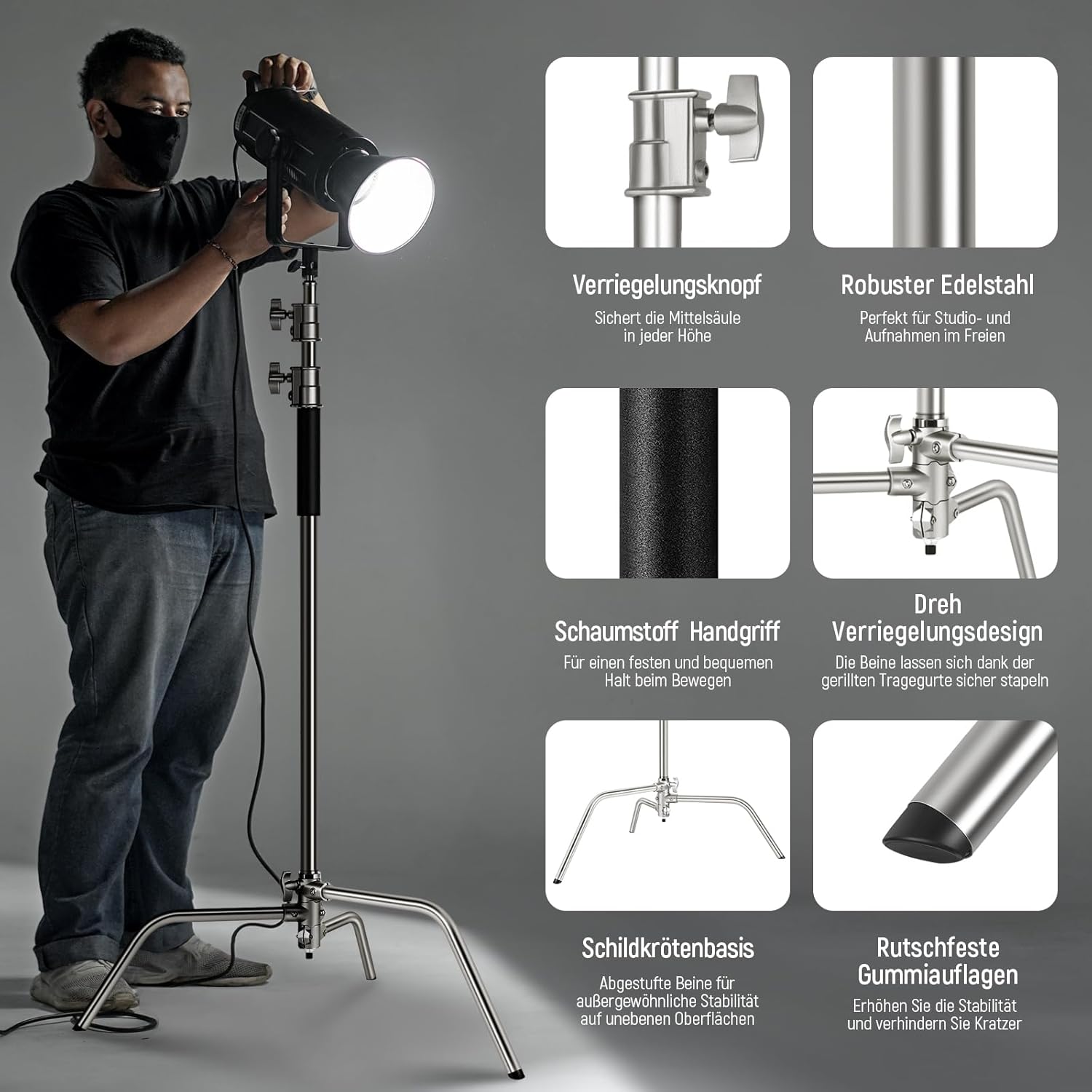 - 【Verstellbar und stabil】Erfüllen Sie die vielfältigen Anforderungen der professionellen Fotografie mit dem einstellbaren Höhenbereich unseres C Stativs von 168cm (5,5 Fuß) bis 340cm (11,2 Fuß). Seine stabile dreibeinige Struktur sorgt für die Sicherheit Ihrer Ausrüstung. Eine kurze Schwammhülle liegt angenehm in der Hand und verhindert, dass der Ständer beim Bewegen verrutscht