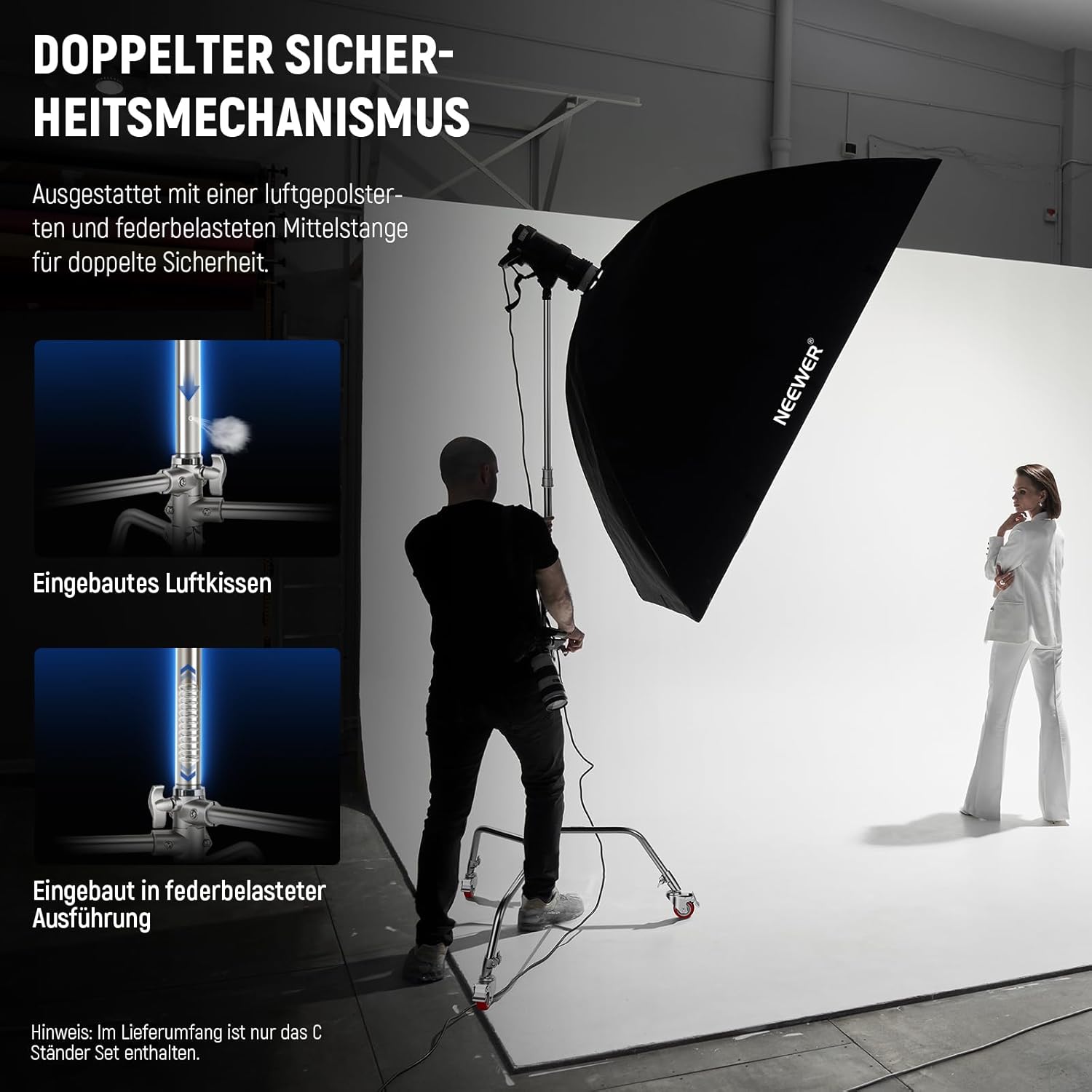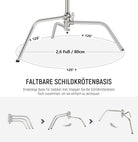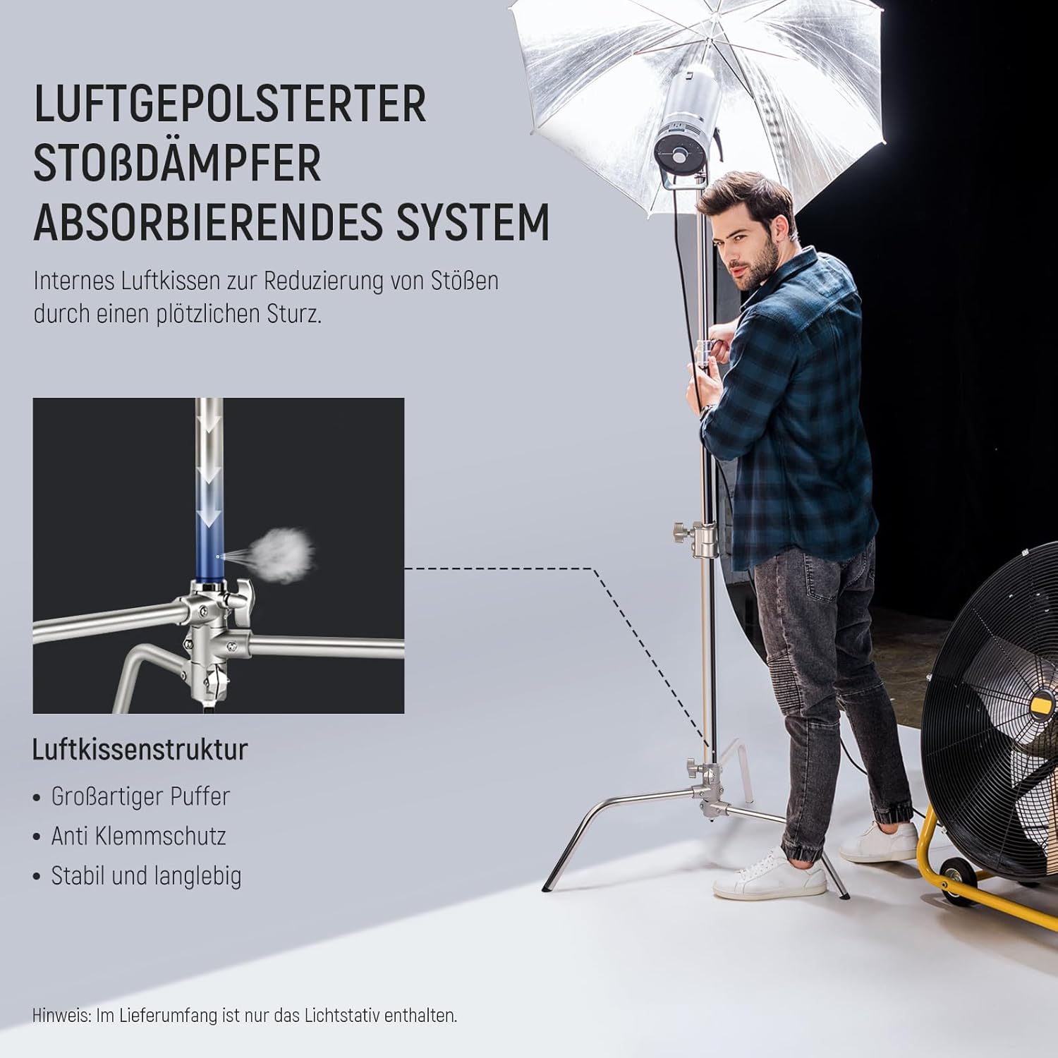 Robuster federbelasteter Lichtständer- Hergestellt aus 100 % robustem Edelstahl, kann dieser C-Ständer Stroboskope, Monolights, Reflektoren, Softboxen, Regenschirme und andere Fotoausrüstung mit außergewöhnlicher Stabilität montieren. Das interne Luftpolster und das Federdesign verhindern plötzliche Stürze der Ausrüstung und reduzieren das Schadensrisiko