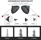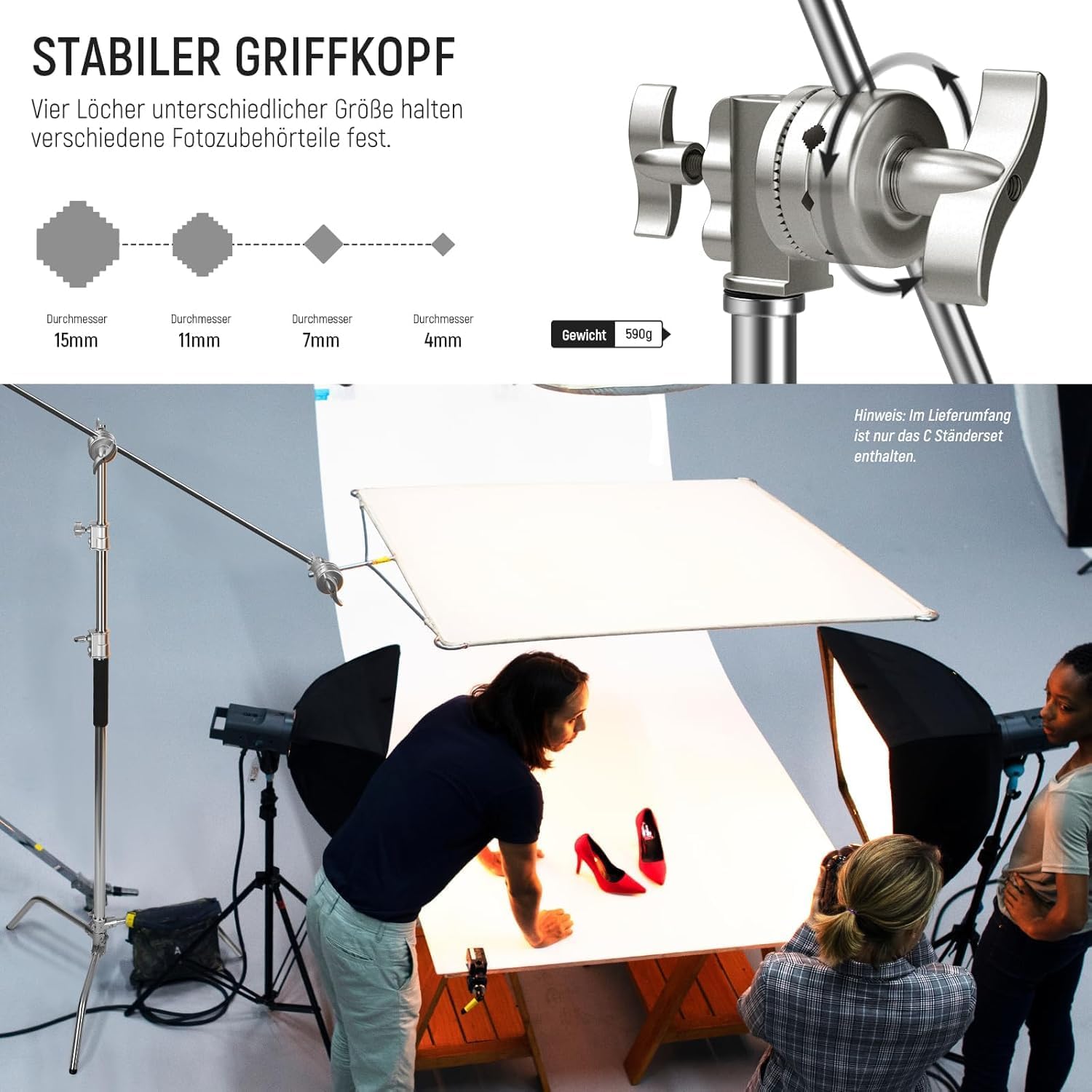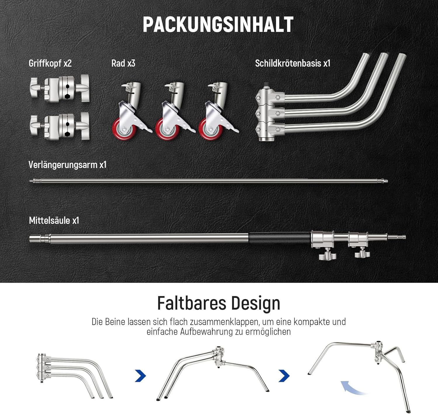 - 【Mehrfachverwendung】Dieser professionelle C Ständer ist ideal für die Montage von CB60 RGB 70W/RGB1200 LED Videoleuchten, Blitzlichtern, Reflektoren, Schirmen, SF30120Q/SF-RPBO26 Softboxen usw. Dieses Fotostativ maximiert die Einsatzflexibilität mit seinem 128cm langen Griffarm mit zwei Standard Griffköpfen, sodass Sie Ihre Ausrüstung in mehreren Winkeln und auf verschiedene Arten positionieren können. Konzipiert für den Einsatz in einem Studio und zusammenklappbar für den Transport vor Ort
