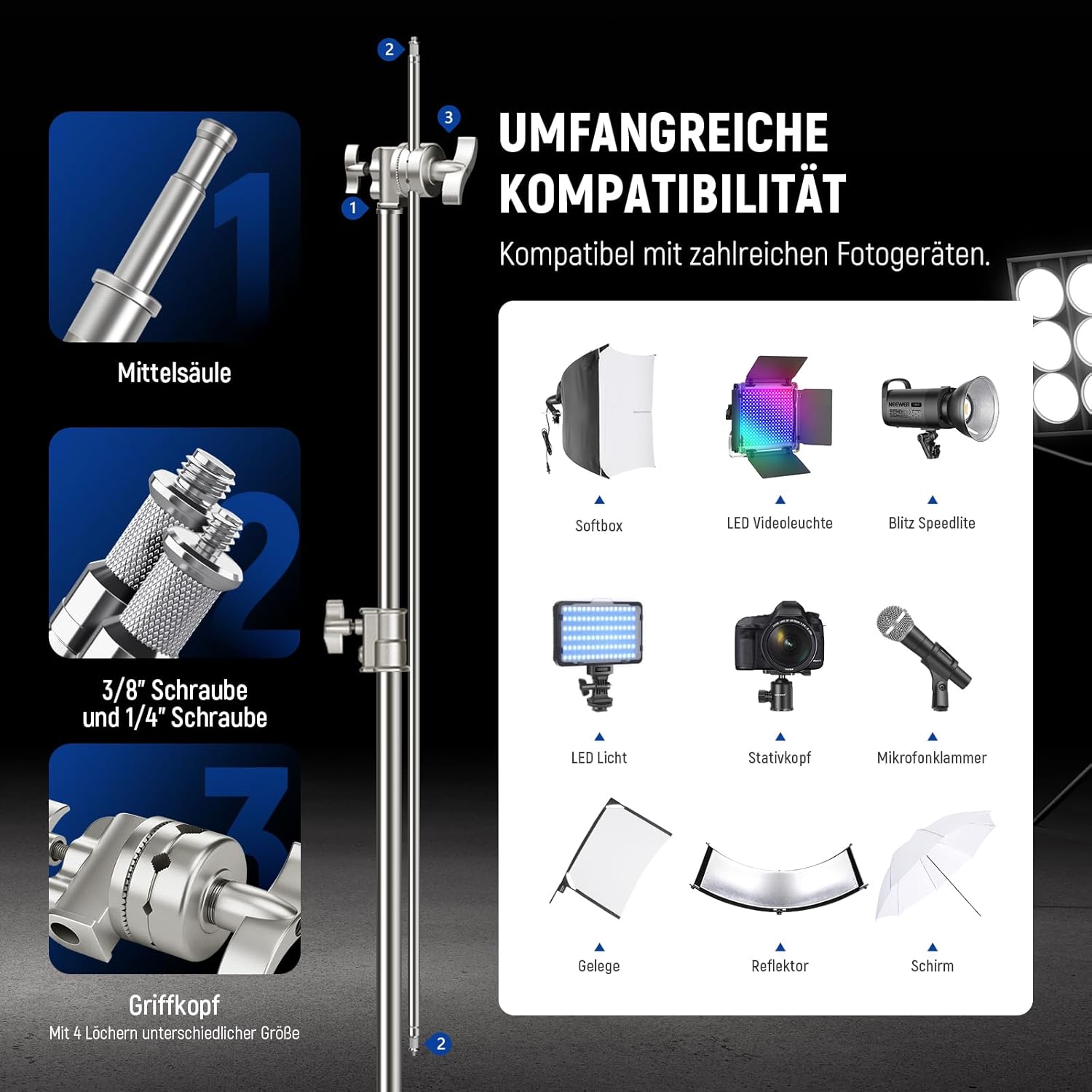 - 【Langlebiger und stabiler Ständer】Dieser aus robustem Edelstahl gefertigte Beleuchtungsständer mit Luftpolsterung sorgt für Langlebigkeit und Stabilität und bietet eine zuverlässige Grundlage für Ihre wertvollen Geräte. Die maximale Tragfähigkeit der Querstange beträgt 8kg. Sie können die Querstange auch abnehmen und als leichten Ständer mit einer maximalen Tragfähigkeit von 20kg verwenden.