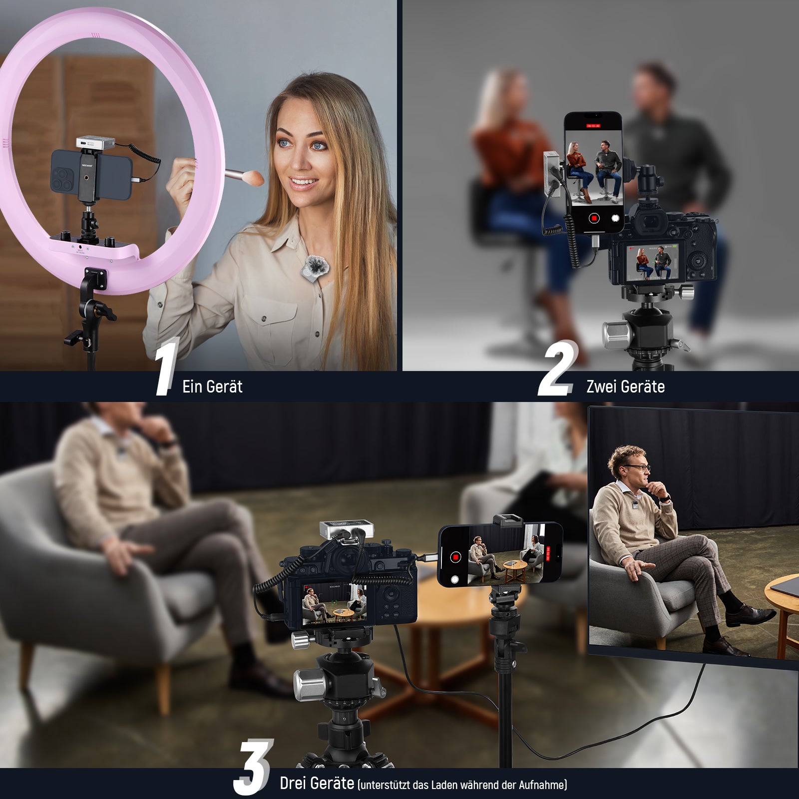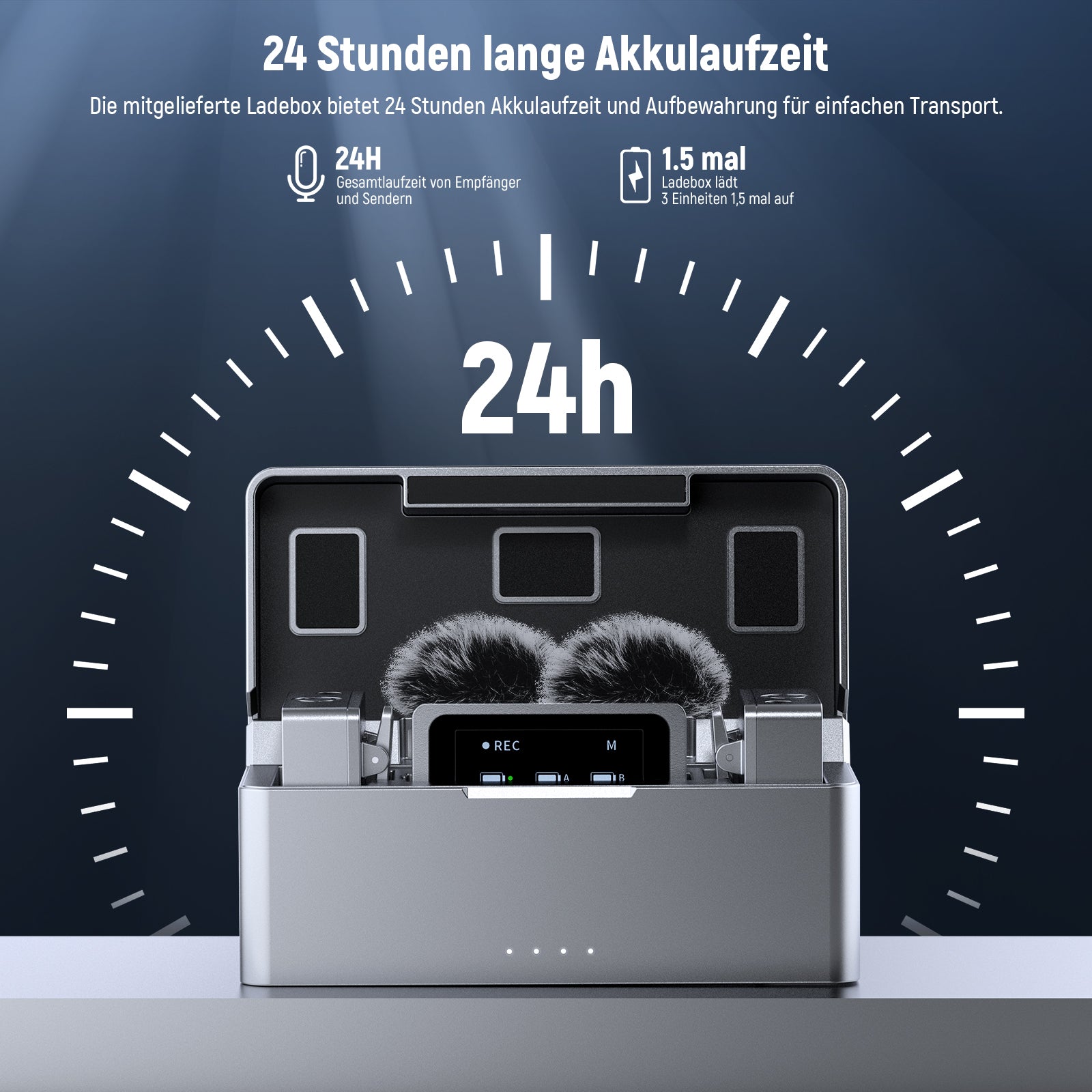 - 22 Stunden verlängerte Akkulaufzeit- Das Ladegehäuse hält 10 Stunden bei voller Ladung (interne Aufnahme deaktiviert) und lädt die Sender und Empfänger 1,5 Mal auf. Empfänger und Sender halten bei voller Ladung 25 Stunden, sodass Sie den ganzen Tag aufnehmen können