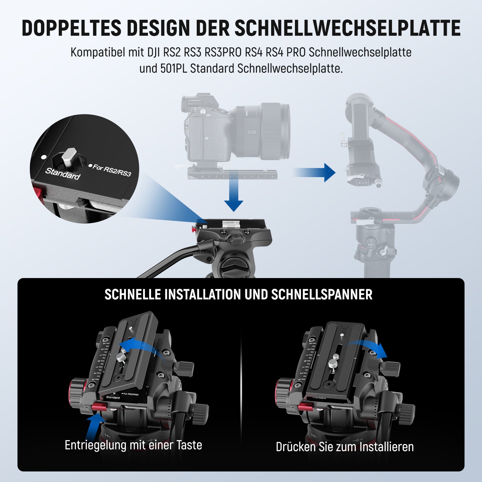 - Schneller und einfacher Moduswechsel- Der Fluidkopf verfügt über zwei QR Modi, die kompatibel mit DJI RS4 RS4 PRO RS2 RS3 RS3 Gimbal. Im Vergleich zur herkömmlichen Einschubstruktur können Sie die Schnellwechselplatte direkt von der Oberseite des Fluidkopfes drücken und in 1 Sekunde verriegeln sowie die Platte über den seitlichen Entriegelungsknopf schnell lösen, was den Wechsel zwischen Stativ und Gimbal Aufnahmen effizienter und bequemer macht