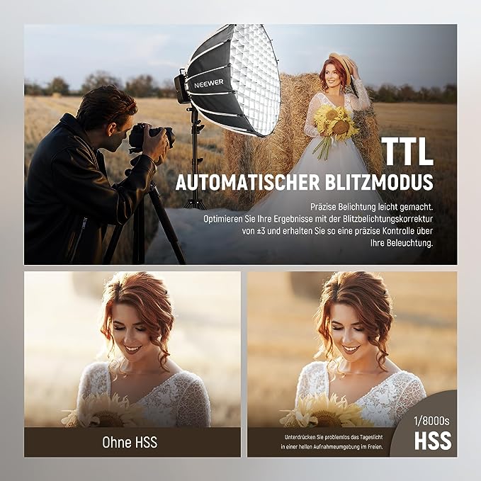 - Ideal für Studio- und Außenaufnahmen, Hochzeiten, Porträts, Produktfotografie und Eventfotografie.