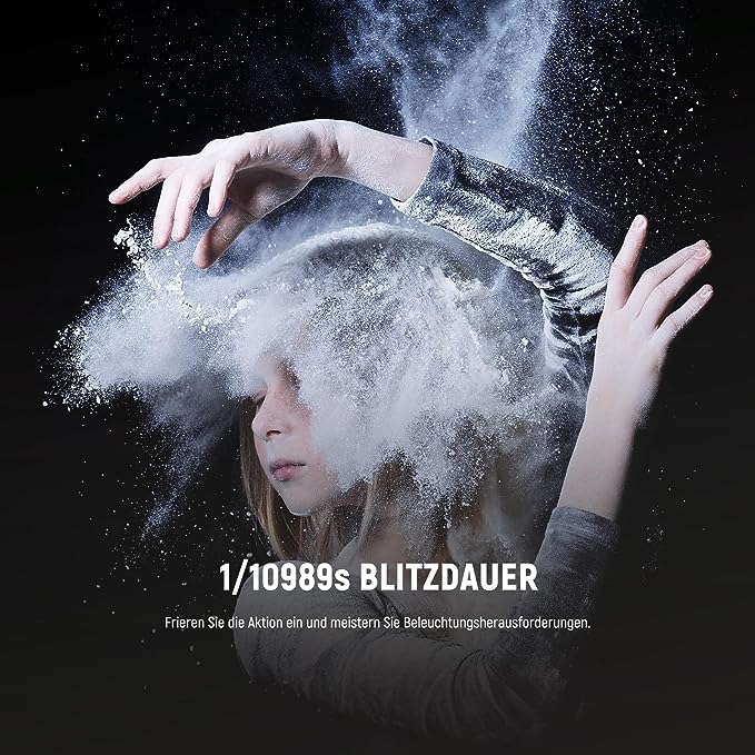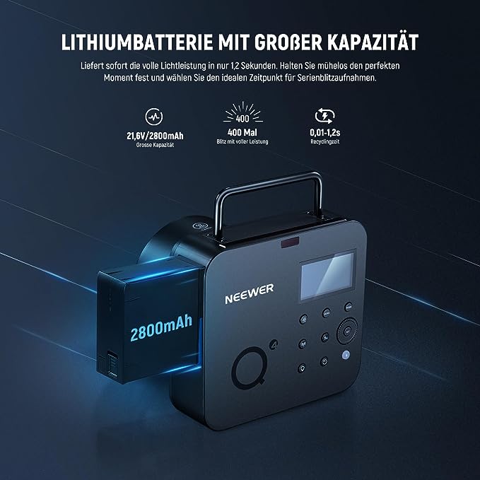 - Hochleistungsbatterie: 21,6V/2800mAh Lithiumbatterie für 400 Blitze bei voller Leistung, schnelle Wiederaufladezeit von 0,01-1,2s und eine Blitzdauer von 1/209-1/10989s. Einfach austauschbares Batteriefach und DC Ladeanschluss für schnelles Aufladen.