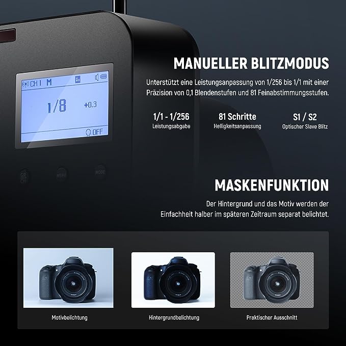 - Integriertes 2,4G Q System: Steuerung über QPRO Auslöser mit 5 Gruppen (A/B/C/D/E) und 32 Kanälen, Reichweite bis zu 100m. Maskierungsfunktion zur getrennten Belichtung von Motiv und Hintergrund.