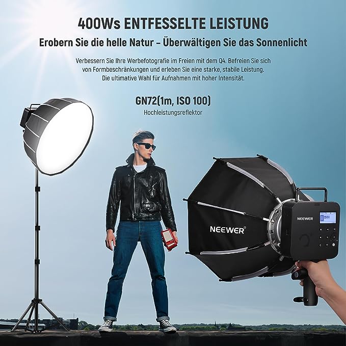 - Leistungsstarker Blitz: 400Ws Blitzlicht mit GN72, kompakt und leicht (2,24kg), mit neuem Design und kompatibel mit Bowen Zubehör.