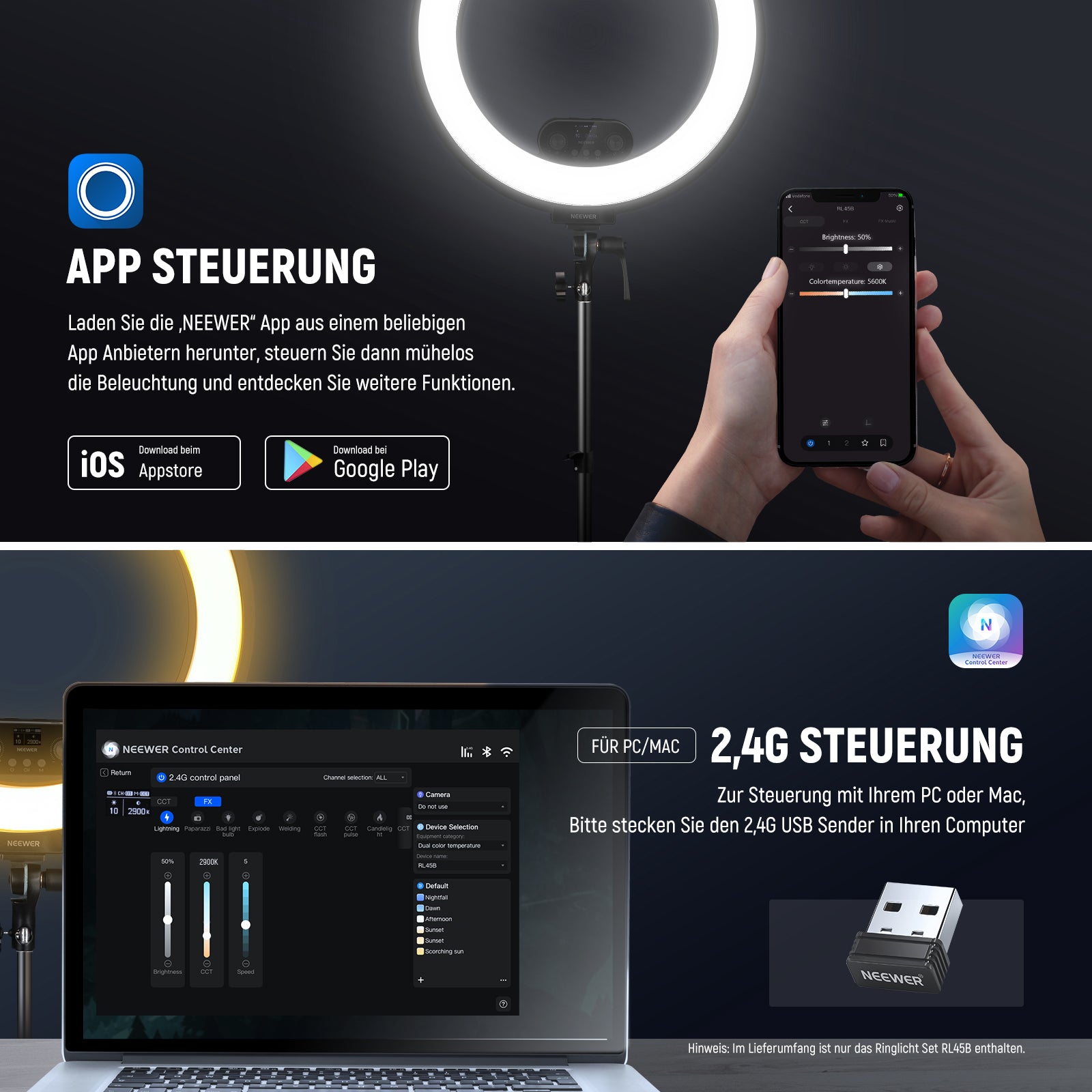 - 【APP/2,4G Steuerung für PC und Mac】Laden Sie die „NEEWER“ App aus einem beliebigen App Store herunter, koppeln Sie Ihr Handy über Bluetooth mit dem RL45B in der App, steuern Sie dann mühelos die Beleuchtung und erkunden Sie weitere Funktionen. Zur Steuerung mit Ihrem PC oder Mac schließen Sie bitte den 2,4G USB Sender an Ihren Computer an und laden Sie die Software „NEEWER Control Center“ herunter. Stellen Sie RL45B und die Software auf denselben Kanal ein, um die Beleuchtung zu steuern