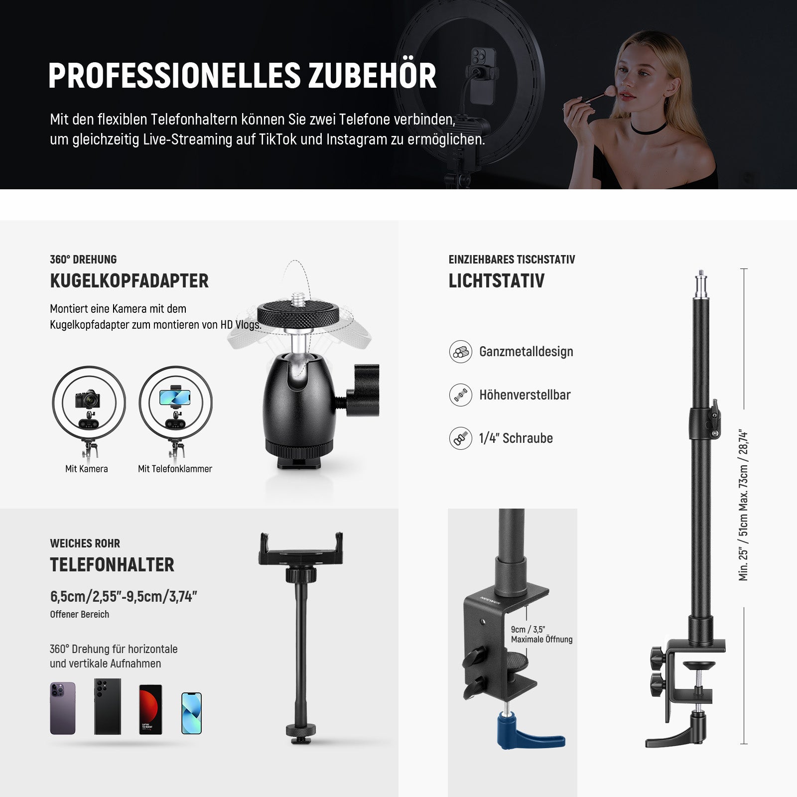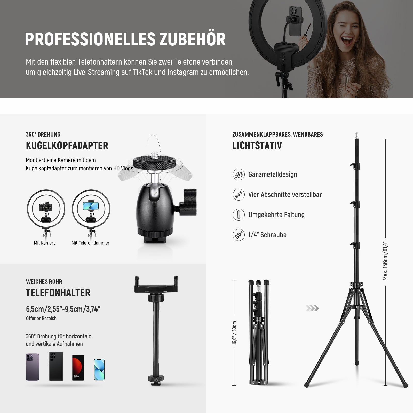 【Telefonhalter/Kamera Kugelkopf】RL45B Ring Leuchte verfügt über drei Zubehörschuhe. Mit den flexiblen Telefonhaltern können Sie 2 Telefone für Live Streaming auf TikTok und Instagram gleichzeitig verbinden oder eine Kamera mit Kugelkopfadapter montieren. Mit Bluetooth Fernauslöser können Sie mit Klick Foto Video auf Handy aufnehmen, kompatibel mit iPhone 16 15 Pro Max 14 13 Plus Mini 12 Samsung Galaxy S24 S23 S22 Ultra Google Pixel 9 8 7 Pro, usw. Die Tragetasche bietet Platz für das gesamte Set