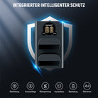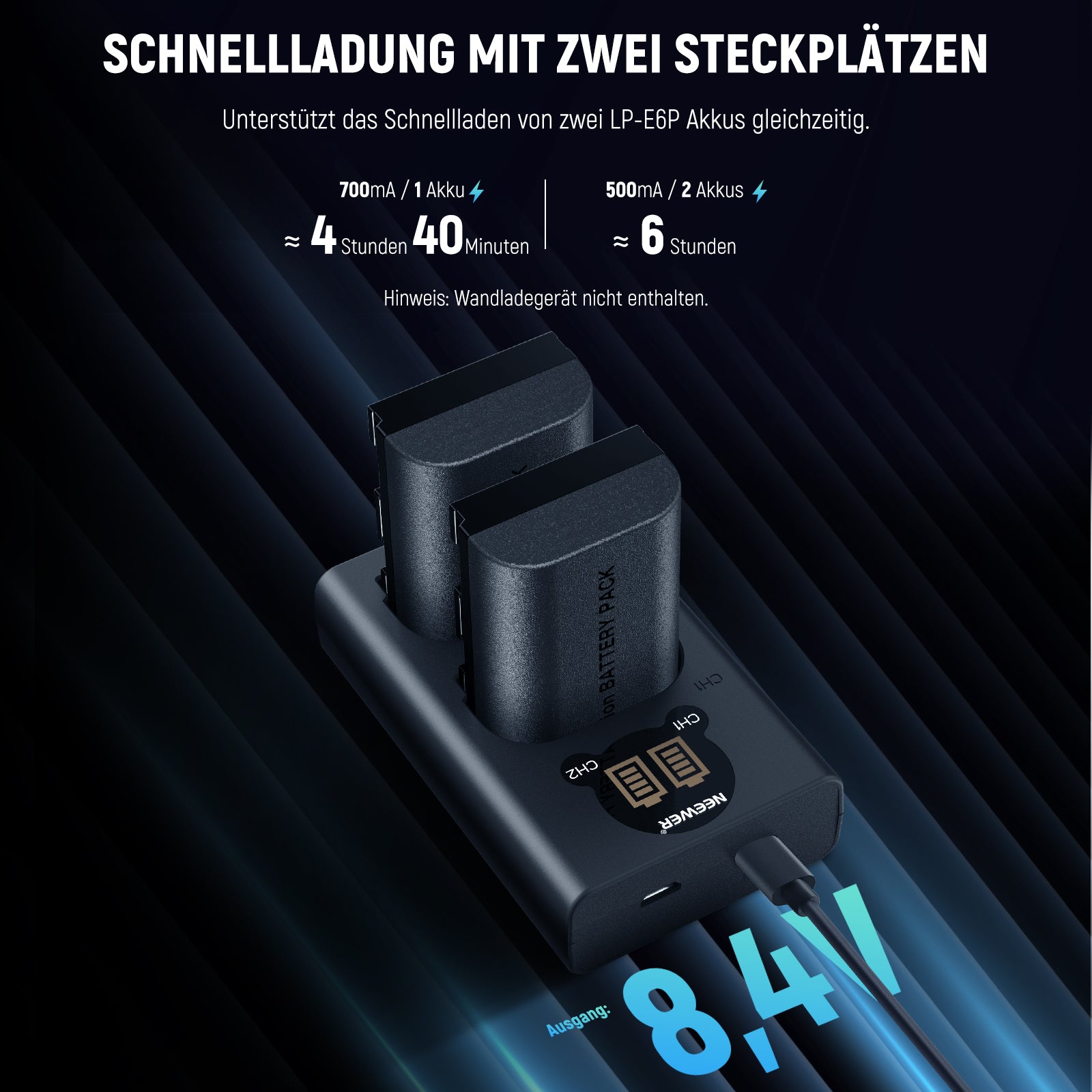 - Ausgang (beide Slots): 8,4 V 500 mA