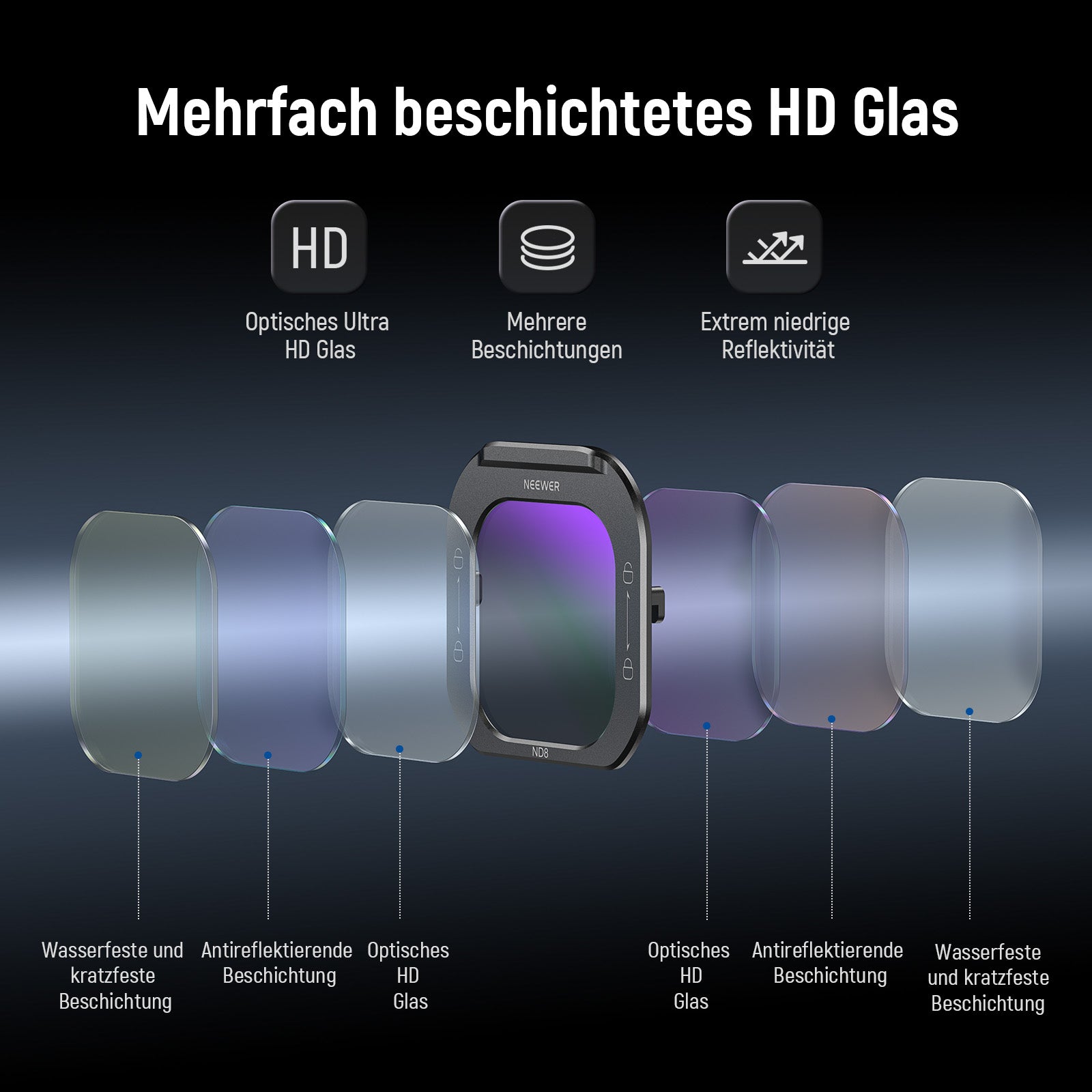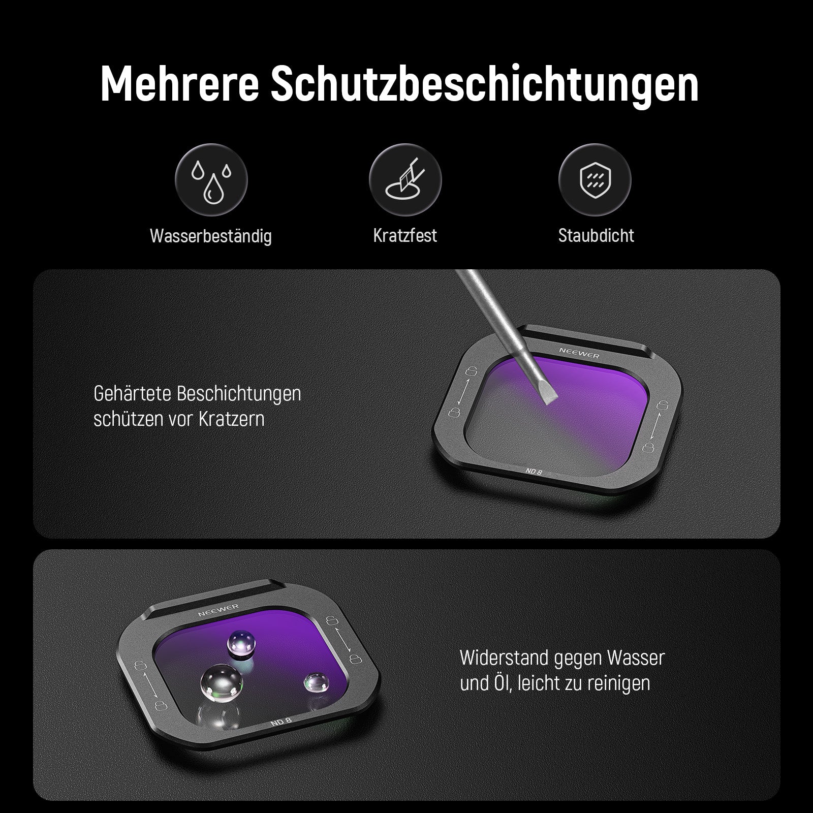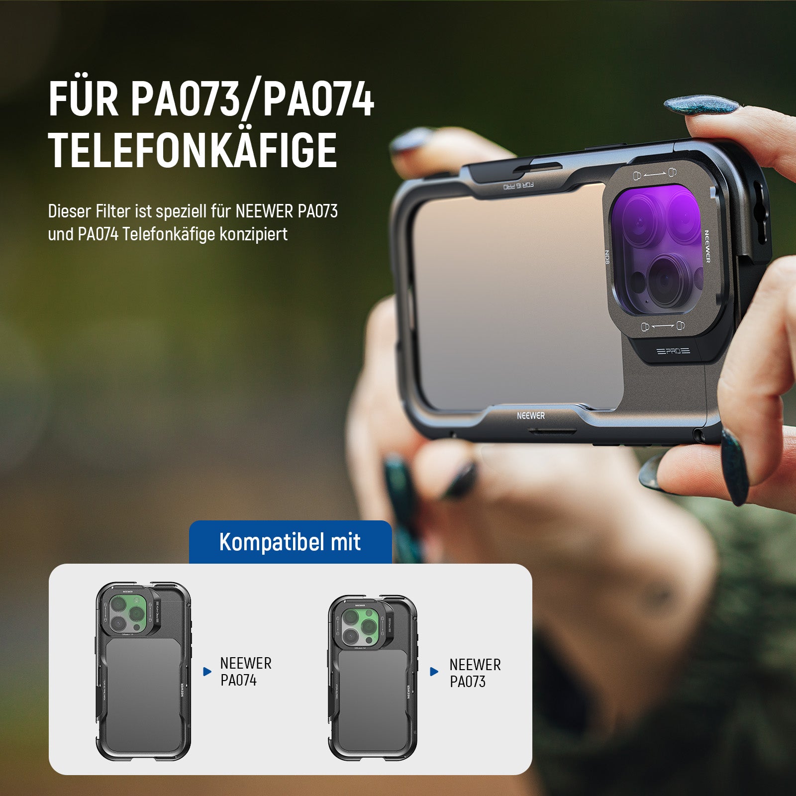 - Für PA073/PA074 Telefonkäfig- Nur für NEEWER PA073 (für iPhone 16 Pro) und PA074 (für iPhone 16 Pro Max) Handykäfige. Dieses Filter Zubehörset enthält einen Black Diffusion 1/4 Filter und vier ND Filter (ND8/ND16/ND32/ND64) für eine verbesserte Erstellung von Fotoinhalten, da die unverzichtbare Ausrüstung für den Ersteller von Inhalten und die unverzichtbare Ausrüstung für Influencer erforderlich sind