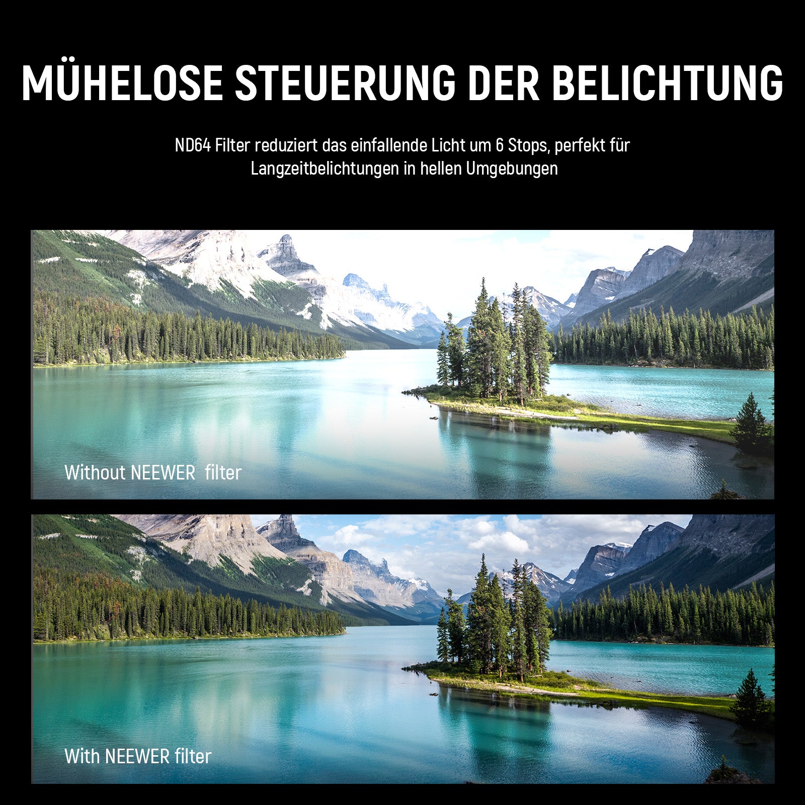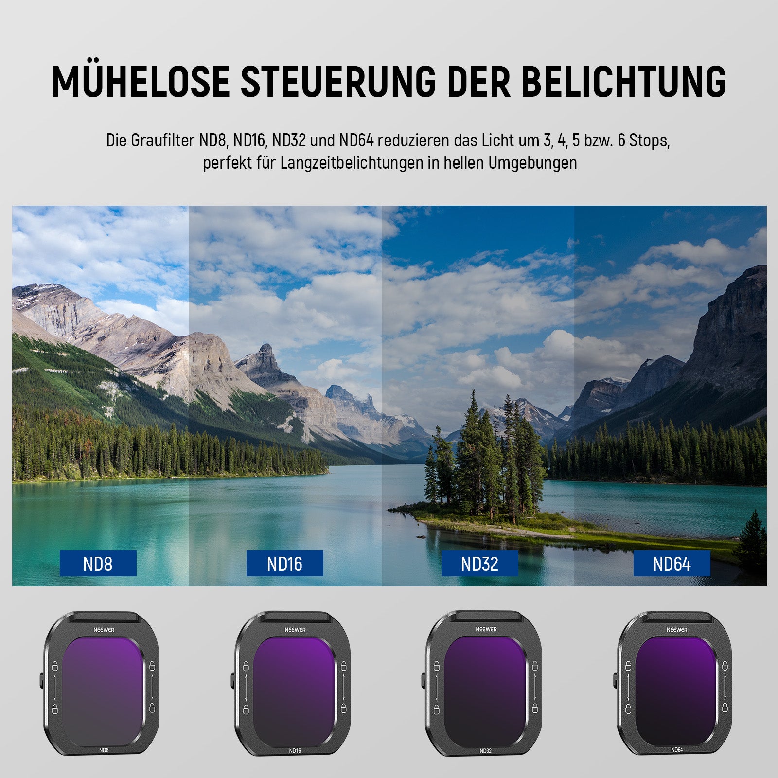 - Mühelose Steuerung der Belichtung- ND8, ND16, ND32 und ND64 Graufilter reduzieren das Licht um 3, 4, 5 bzw. 6 Stops, perfekt für Langzeitbelichtungsfotografie in hellen Umgebungen. Es ermöglicht Ihnen, mit längeren Verschlusszeiten und größeren Blendenöffnungen zu fotografieren und Bewegungen mit ausdrucksstarker Bewegungsunschärfe einzufangen. Hinweis: Bitte verwenden Sie eine professionelle Kamera App (z. B. Blackmagic Camera), um das automatische Zurücksetzen der Belichtung zu verhindern