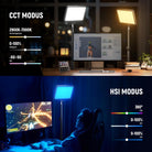 - Vollfarbiges, randbeleuchtetes Hauptlicht- Der GL25C Hauptlicht mit 108 LEDs nutzt die neueste Randbeleuchtungstechnologie und liefert flimmerfreies, weiches Licht mit 2500Lux/0,5m maximaler Beleuchtung bei konstanter Leistung von 25W, wobei die Helligkeit von 0% bis 100% eingestellt werden kann. Das Videolicht verfügt über mehrere Beleuchtungsmodi: CCT (2900K-7000K und ±50 GM Wert), HSI (H: 0-360°, S: 0-100%), RGBCW (R/G/B/C/W: 0-255), FX (18 Szeneneffekte)