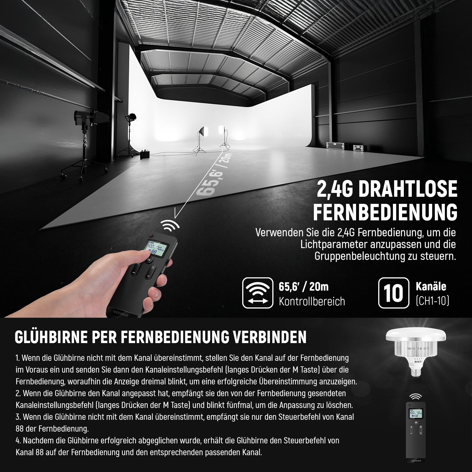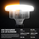 • 45W zweifarbige 2,4G LED Glühbirne- Die 45W Glühbirne verfügt über 88 LEDs (44 warme+44 kalte LEDs) und bietet Beleuchtungsstärke von bis zu 1400Lux/m 4400K sowie breiten Farbtemperaturbereich von 2700K bis 7000K für zweifarbige Schalten. Verwenden Sie mitgelieferte 2,4G Fernbedienung, um 2 Glühbirnen unabhängig voneinander in Umkreis von 20m zu steuern, wobei jede von ihnen auf 10 Kanäle eingestellt werden kann. Die Fernbedienung kann auf Kanal 88 eingestellt werden, um alle Kanäle zu steuern