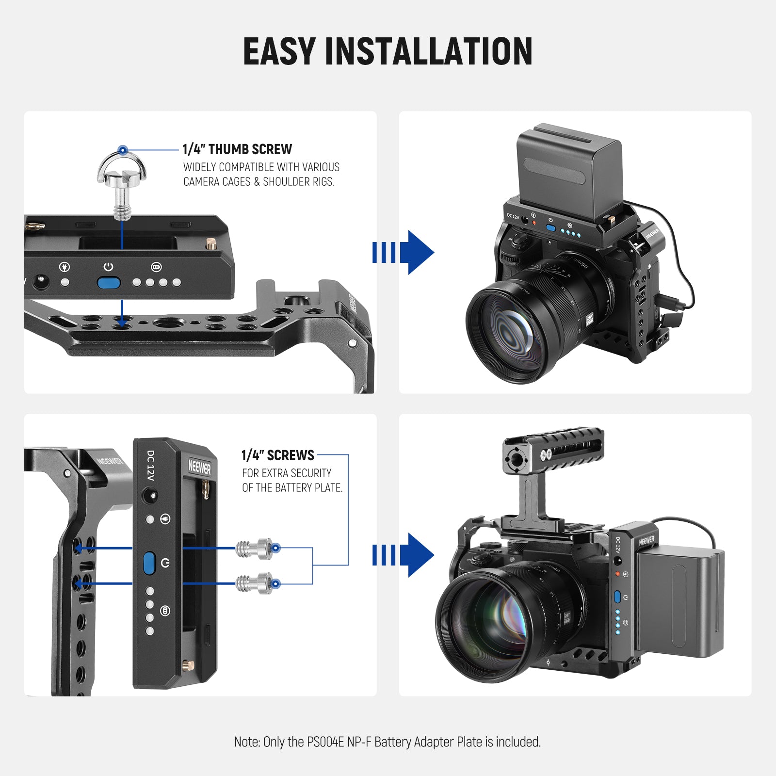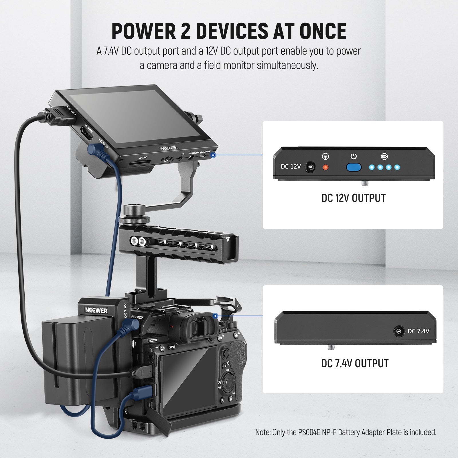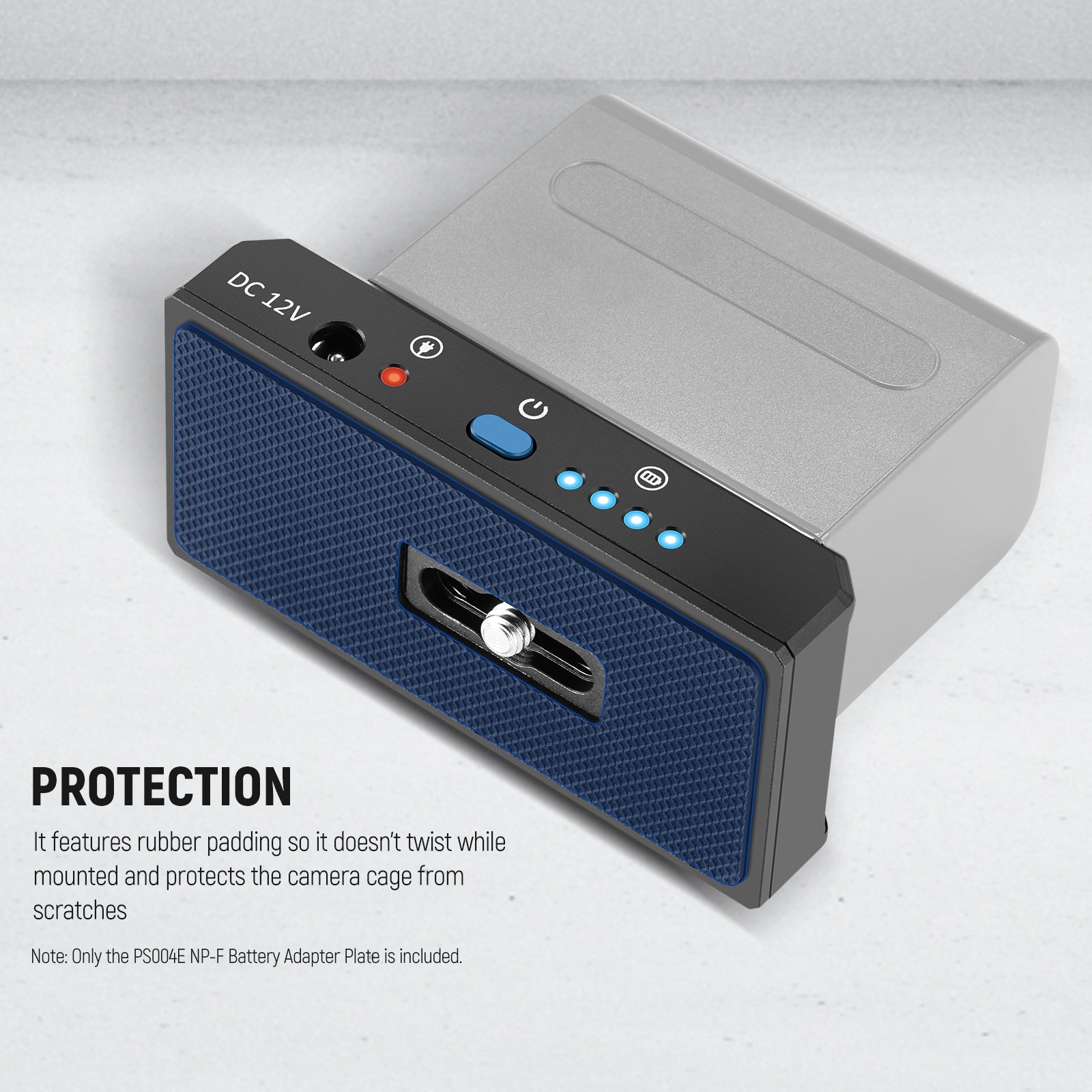 - 【Strom Unterwegs】 Bringen Sie das PS004E mit der 1/4" Rändelschraube oder zwei 1/4" Schrauben an einem Kamerakäfig an und verlängern Sie die Akkulaufzeit Ihrer Kamera unterwegs. Die Gummiauflage sorgt für zusätzliche Stabilität und schützt Ihre Ausrüstung vor Kratzern