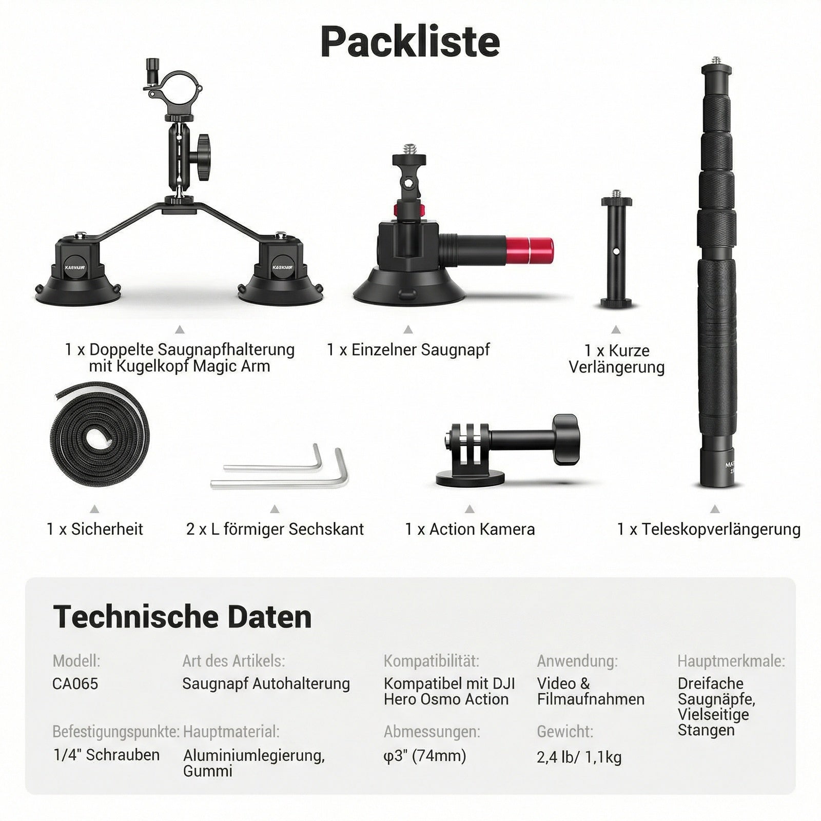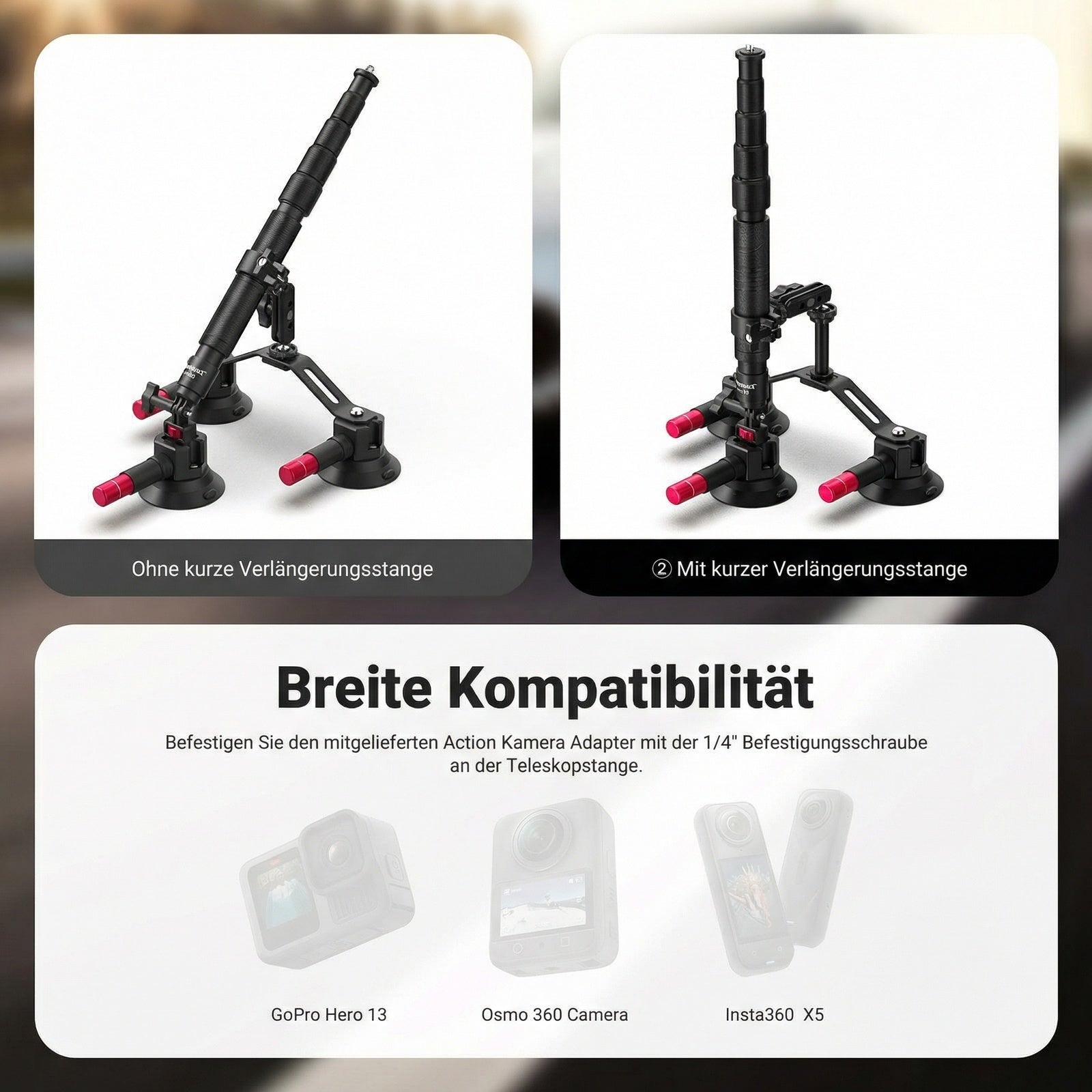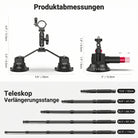- 【Inklusive Action Kamera Adapter】 Die einzelne Saugnapfhalterung, die Teleskopstange und die kurze Verlängerungsstange sind alle mit einer 1/4" Montageschraube für die vielseitige Montage von spiegellosen Vlog Kameras, Camcordern, Telefonhaltern, Action Kamera Adaptern und mehr ausgestattet ( nur der Action Kamera Adapter ist im Lieferumfang enthalten. Der Action Kamera Adapter ist kompatibel mit DJI OSMO 360 Action 6 5 Pro 4, GoPro 13 Hero13 Hero 12 11 10 9 Black Go Pro Max, Insta360 X5 X4 X3 X2 und mehr