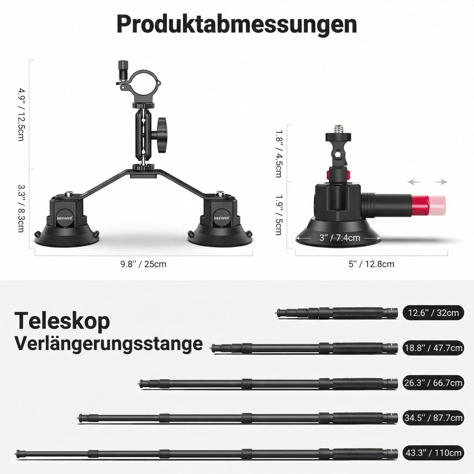 - 【Vielseitige Teleskop Verlängerungsstange/Selfie Stick】 Diese vierteilige Teleskopstange ist von 32cm auf 110cm ausziehbar und wird über eine 1/4" Schraube mit der einzelnen Auto Saugnapf Kamerahalter befestigt und mit 24mm Schrauben befestigt. Kann auch als vielseitiger Selfie Stick verwendet werden, kompatibel mit iPhone 15 Pro Max Plus 14 13 12 Mini Samsung Galaxy Google Pixel Huawei (Telefonhalterung nicht enthalten). Eine 7cm kurze Verlängerungsstange erhöht die Vielseitigkeit