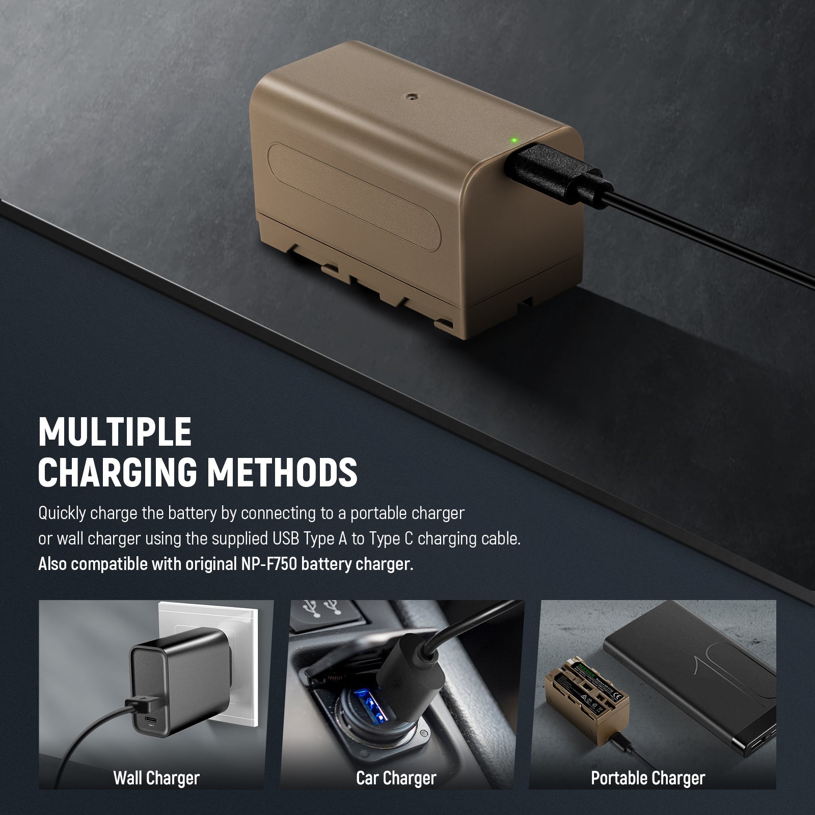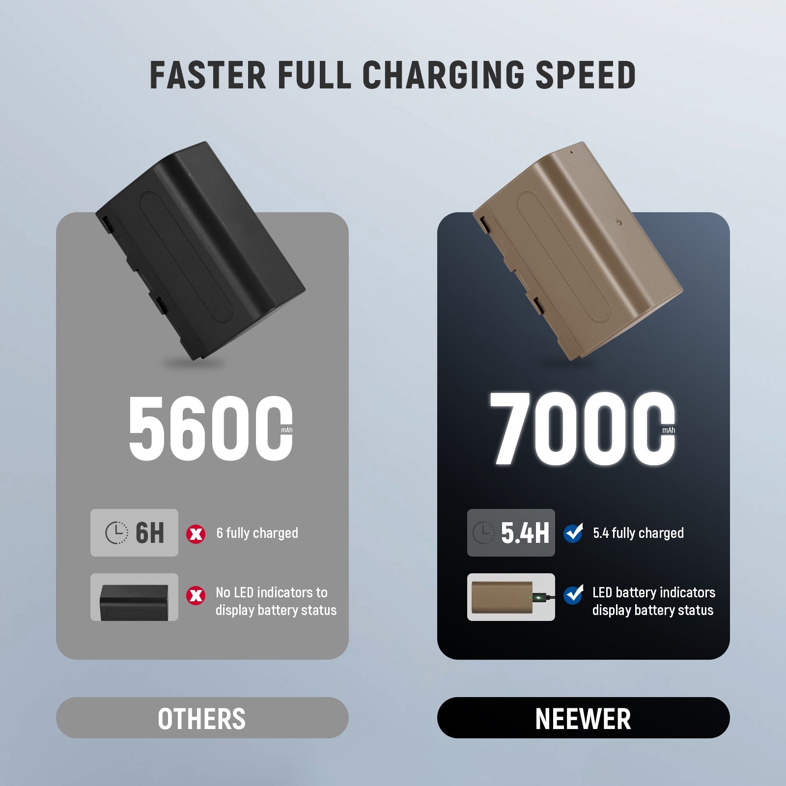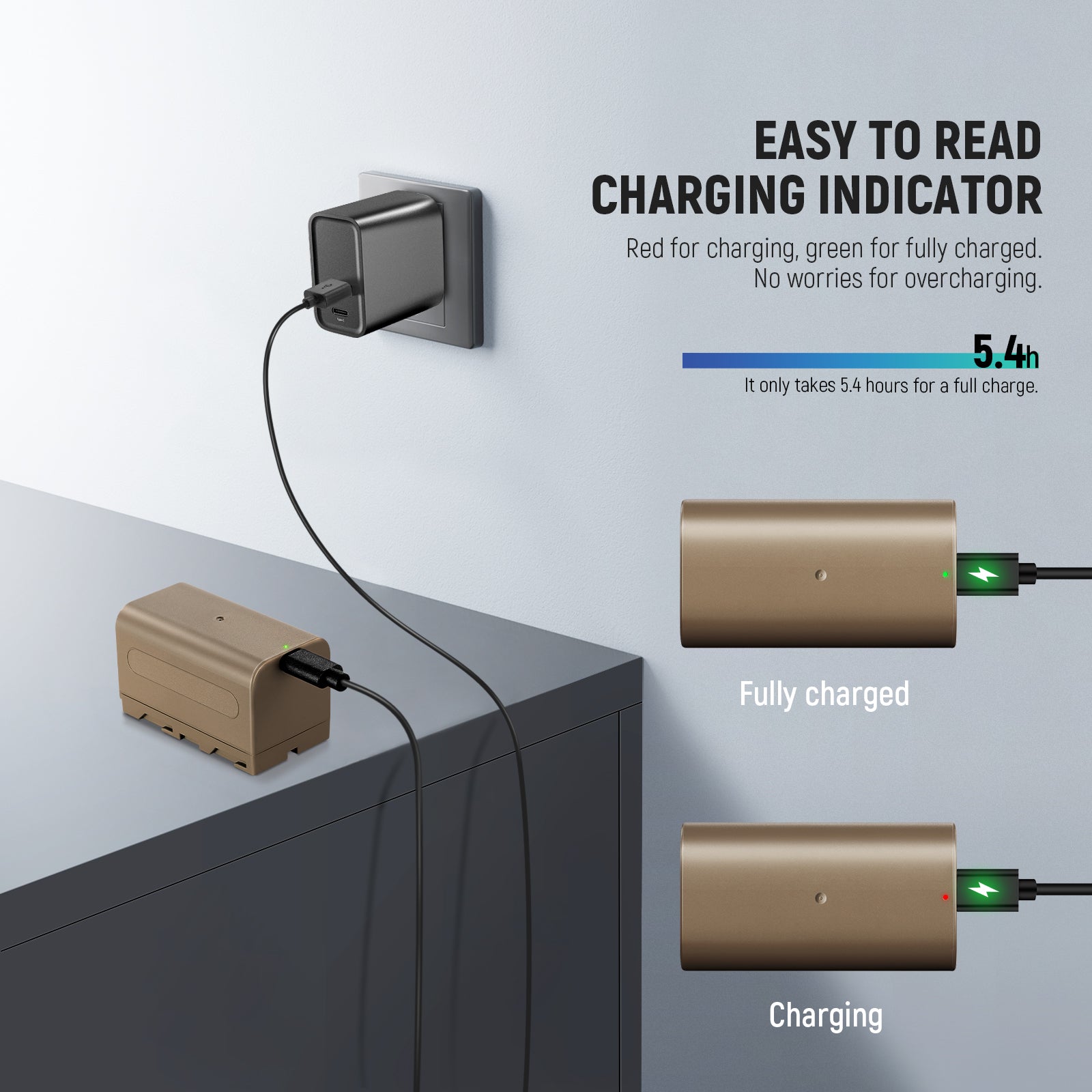 - 【Schnellere Ladegeschwindigkeit】 Dieser NP-F Akku kann mit einem 5V 2A USB Wandladegerät innerhalb von 5,4 Stunden vollständig aufgeladen werden, viel schneller als die 27 Stunden die das Original Akkuladegerät braucht. Hinweis: Die PD Schnellladung wird nicht unterstützt, der Wandladeadapter ist nicht im Lieferumfang enthalten