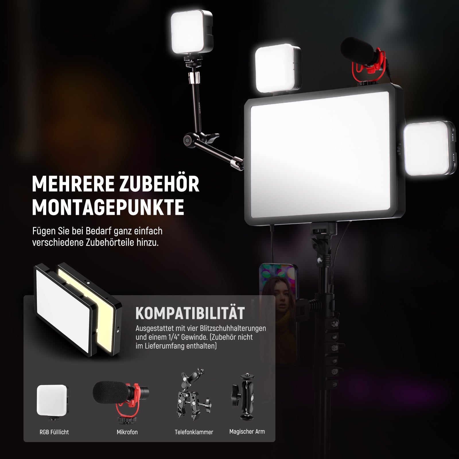 - LED Panel Video Beleuchtungsset- Dieses LED Videoleuchte kann Ihr Erscheinungsbild aufhellen und Sie vor der Webcam erstaunlich aussehen lassen - egal, ob Sie an einem Zoom Meeting teilnehmen, live auf Social Media streamen, einen Vlog für Ihren YouTube Kanal drehen, als Content Creator Podcast-Videografie machen oder einfach als Make up Künstler ein Make up Studiolicht suchen
