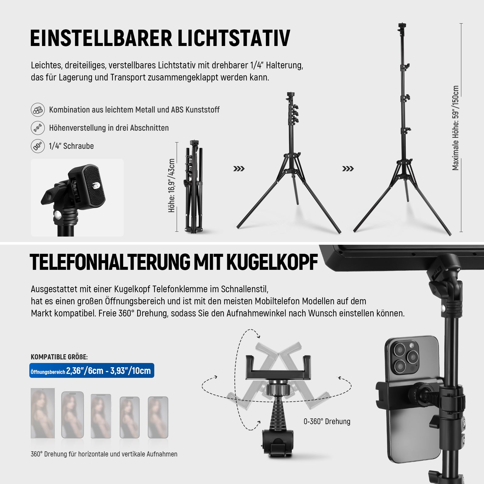 - Verstellbarer Lichtständer und Telefonhalter- Die 3 teiligen Teleskop Stative lassen sich bis auf 150cm ausziehen und verfügen über einen 1/4" Kugelkopf, der eine vertikale Neigung von 180° und eine horizontale Drehung von 360° unterstützt. Die Beine können flach zusammengeklappt werden, wodurch der Ständer auf eine Größe von 43cm für Transport reduziert wird. Es sind 2 Telefonhalter enthalten, die eine 360° Schwenkung Ihres Handys ermöglichen und mit Geräten von 6-10cm kompatibel sind
