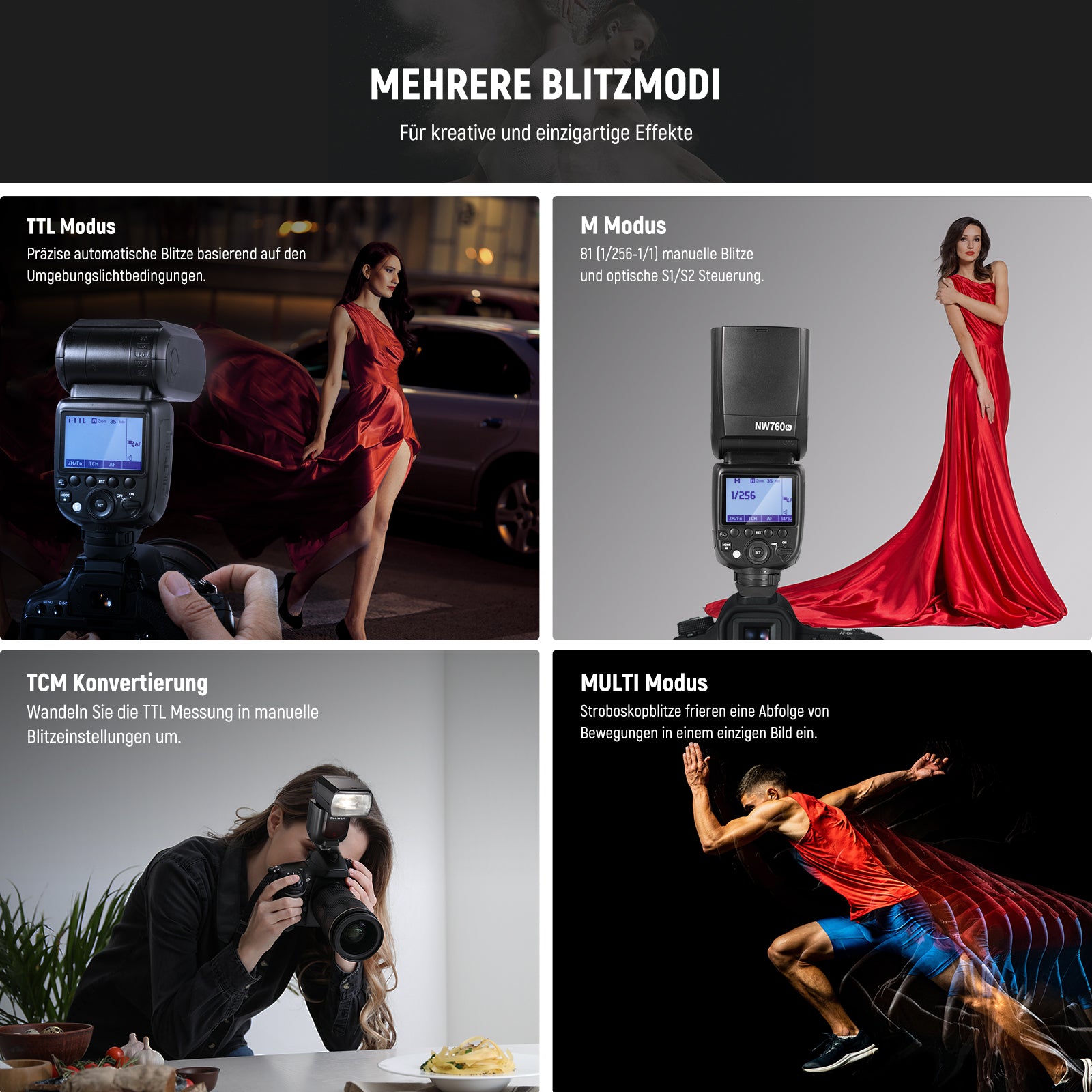 - TTL/M/MULTI Blitzmodi- Ausgestattet mit den Modi E-TTL II (automatisch), M (manuell) und MULTI (Stroboskop). Der M Modus unterstützt 81 Leistungsstufen (1/256–1/1) mit einem TCM Schalter zur schnellen Umstellung zwischen TTL und M. Außerdem unterstützt er 1/8000s HSS, 0,1–2,7s Recyclingzeit, 1/300s -1/20.000s Blitzdauer, 100 Stroboskopblitze (199Hz), Blitzbelichtungskorrektur (FEC), Blitzbelichtungsreihe (FEB), Blitzbelichtungsspeicherung (FEL), Synchronisation vorne/hinten und optisch S1/S2