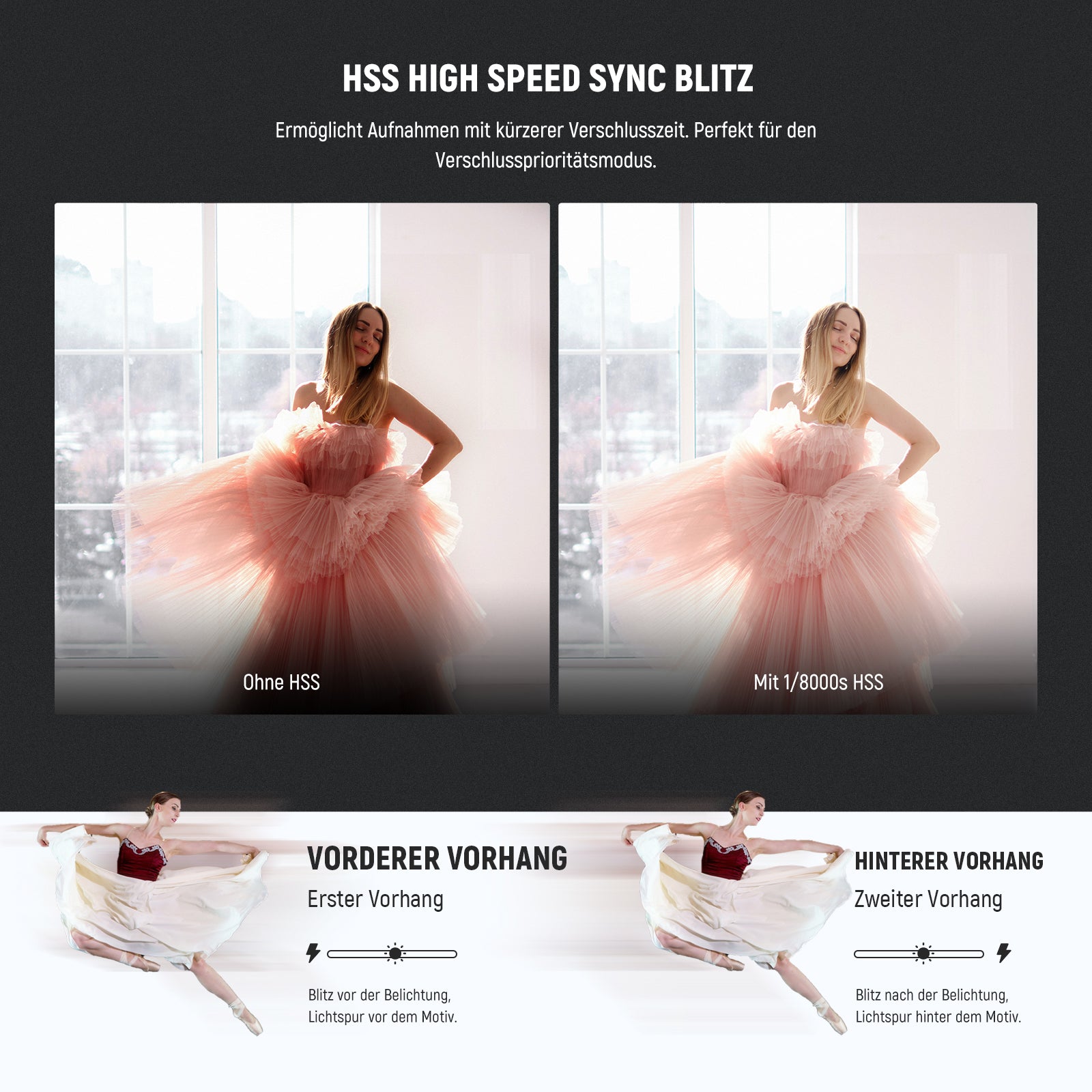 - Flexible Blitzwinkel und Blitzeffekte- Der Blitzkopf unterstützt Neigungen von -7° bis 120° und eine Drehung um 360° für flexible Blitzreflexionen und -Reflexionen. Der mitgelieferte Reflektor und die Weitwinkel Diffusionsplatte können Ihre Augen zum Strahlen bringen und die Blitzabdeckung erweitern, um ein weiches und natürliches Ergebnis zu erzielen. Der HD LCD Bildschirm ermöglicht individuelle Anpassung, Standby, Autofokus Hilfsstrahl und Hintergrundbeleuchtung für eine bequeme Bedienung