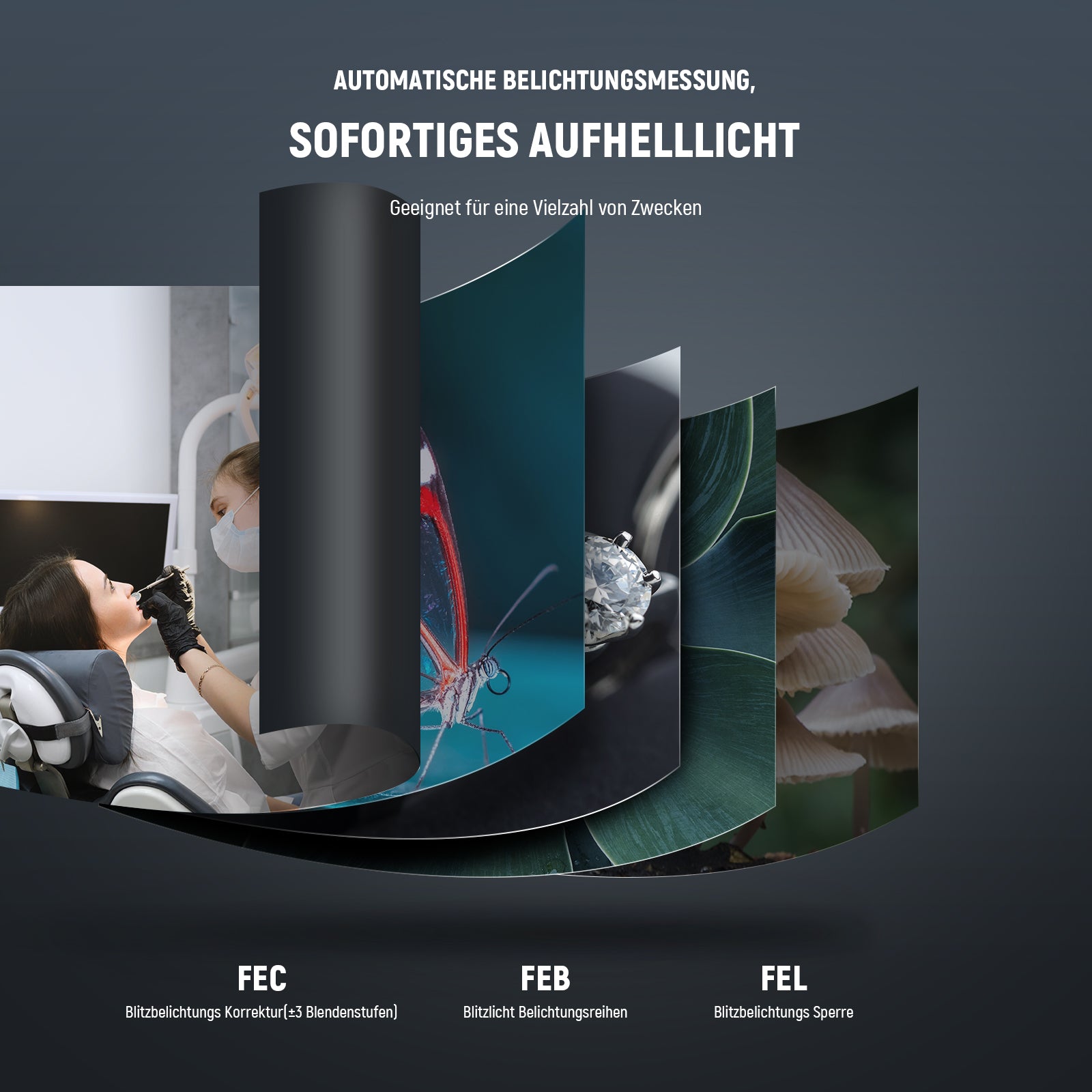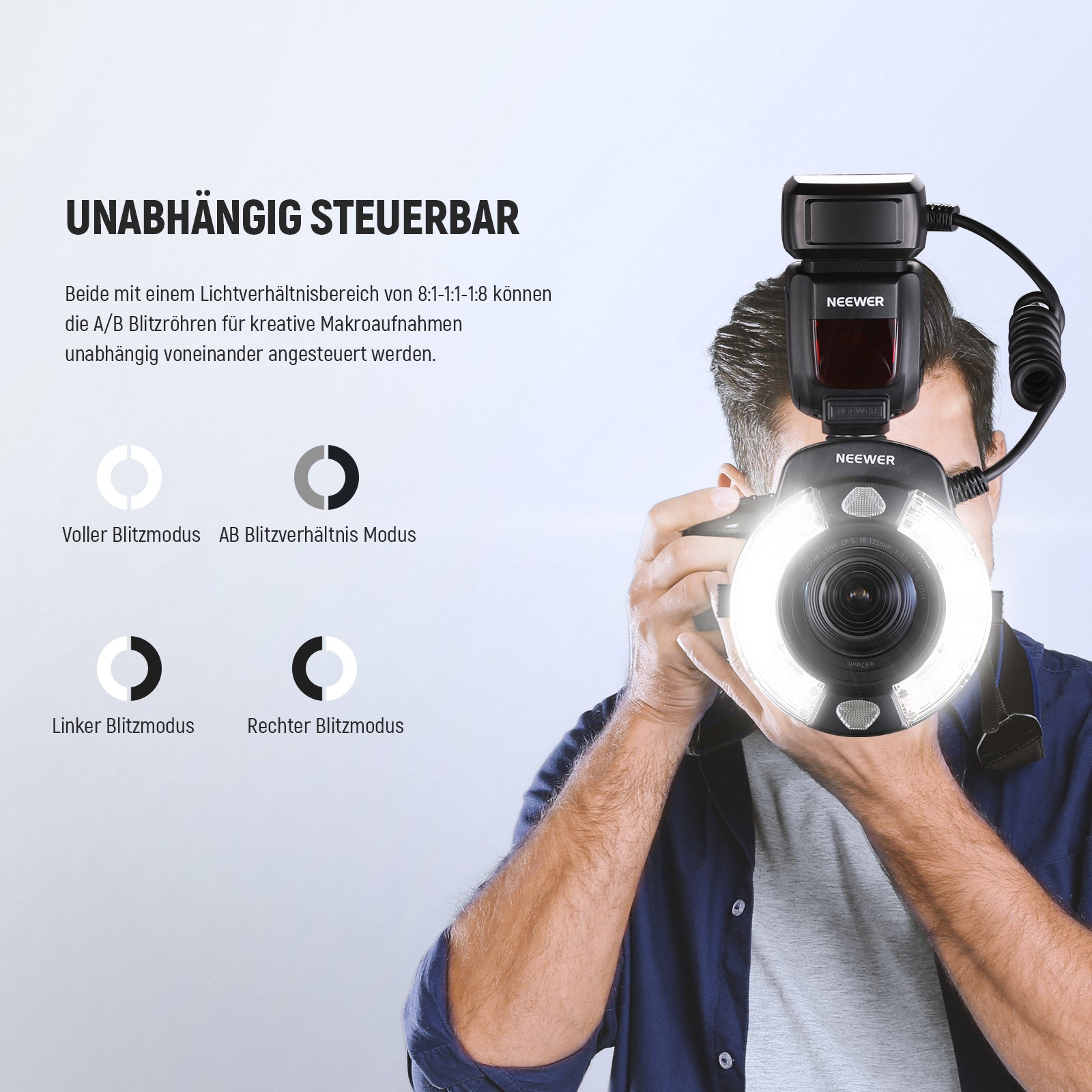 - 【3 Blitzmodi und unabhängige Blitzröhren】 Der TTL Modus sorgt automatisch für eine richtige Belichtung; Der M Modus unterstützt eine einstellbare manuelle Blitzleistung von 1/1 -1/128; der MULTI Modus bietet kreative Stroboskopblitze. Die A/B Blitzröhren sind unabhängig und gemeinsam steuerbar. Im TTL/M Modus ist das Blitzverhältnis 8:1-1:1-1:8 in 1/2 Stufen einstellbar, um den Bildkontrast fein abzustimmen