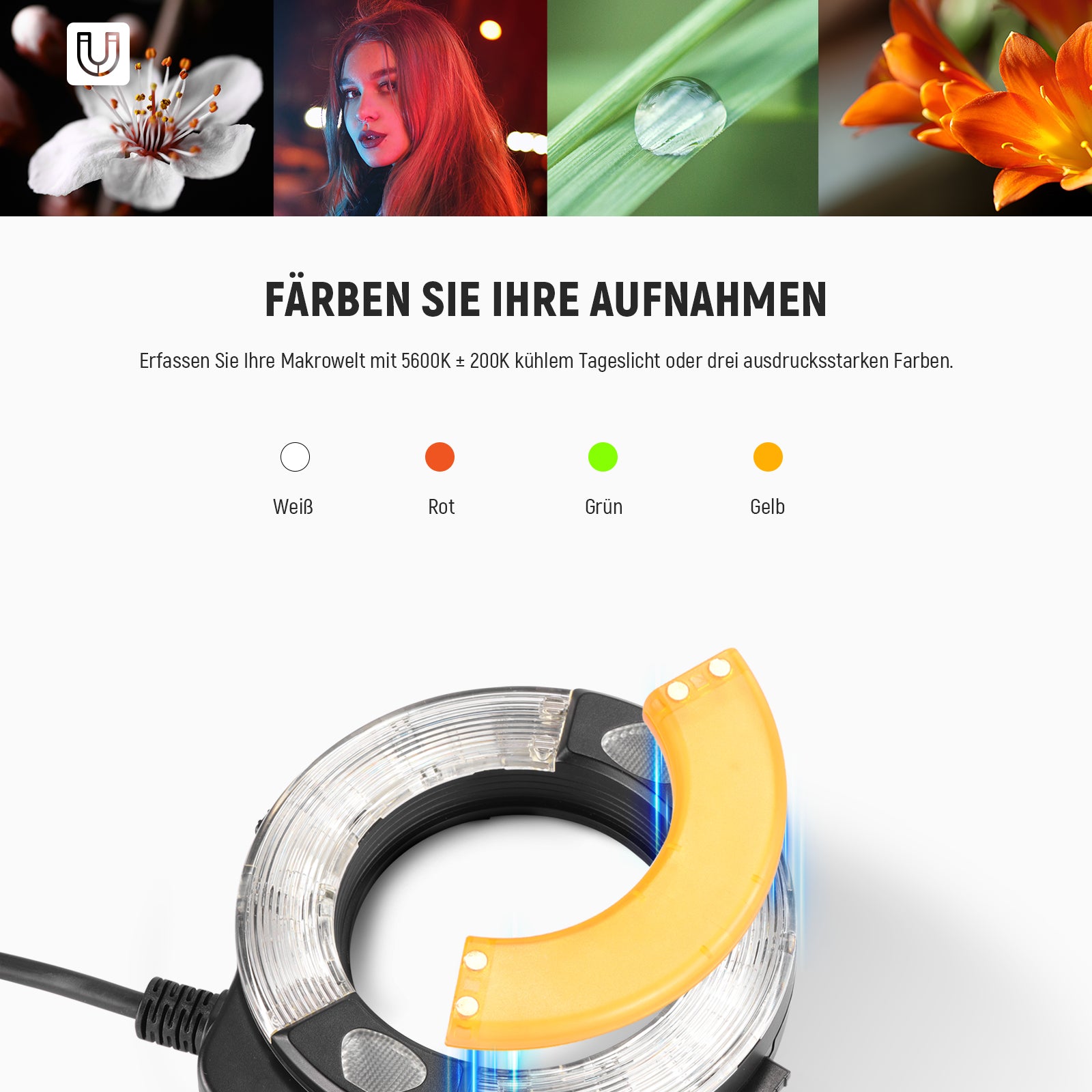- 【4 Farbgelfilter und 8 Objektiv Adapterringe】 Weiße, rote, grüne und gelbe Farbgelfilter helfen Ihnen bei der Aufnahme stimmungsvoller und künstlerischer Makroaufnahmen. 8 Adapterringe sind für Kameraobjektive mit 49/52/55/58/62/67/72/77mm Filtergewinde geeignet