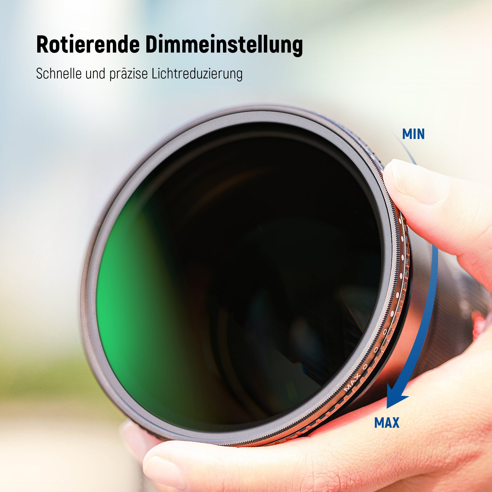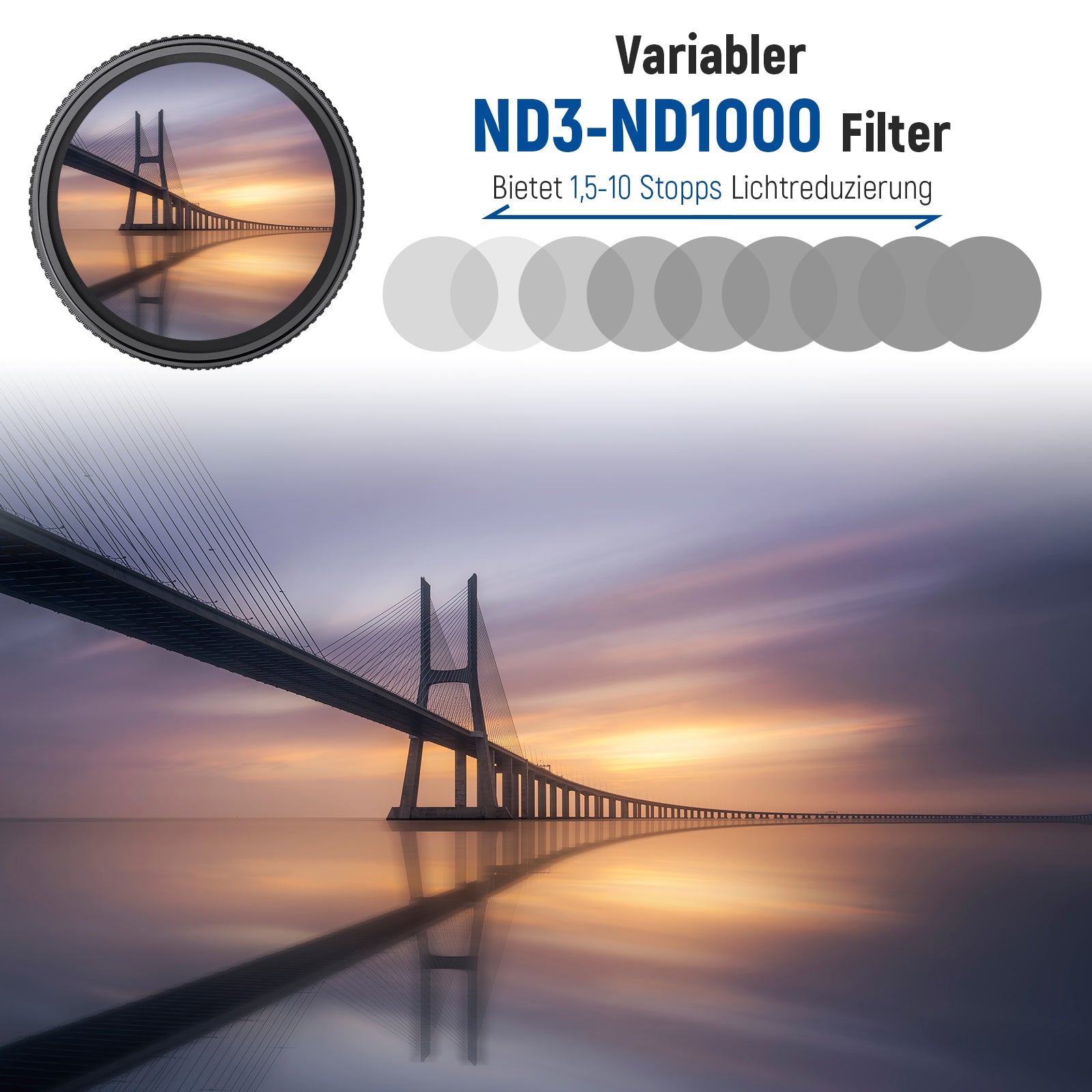 - 【Variabler Neutraldichtefilter】 Mit dem breiten Neutraldichtebereich von ND3-ND1000 hilft der variable ND Filter, verschiedene Lichtverhältnisse problemlos zu bewältigen. Von bewölkten bis zu hellen sonnigen Tagen drehen Sie einfach den Filterring, um die Lichtmenge anzupassen, die in Ihr Kameraobjektiv eintritt, um eine Überbelichtung zu vermeiden