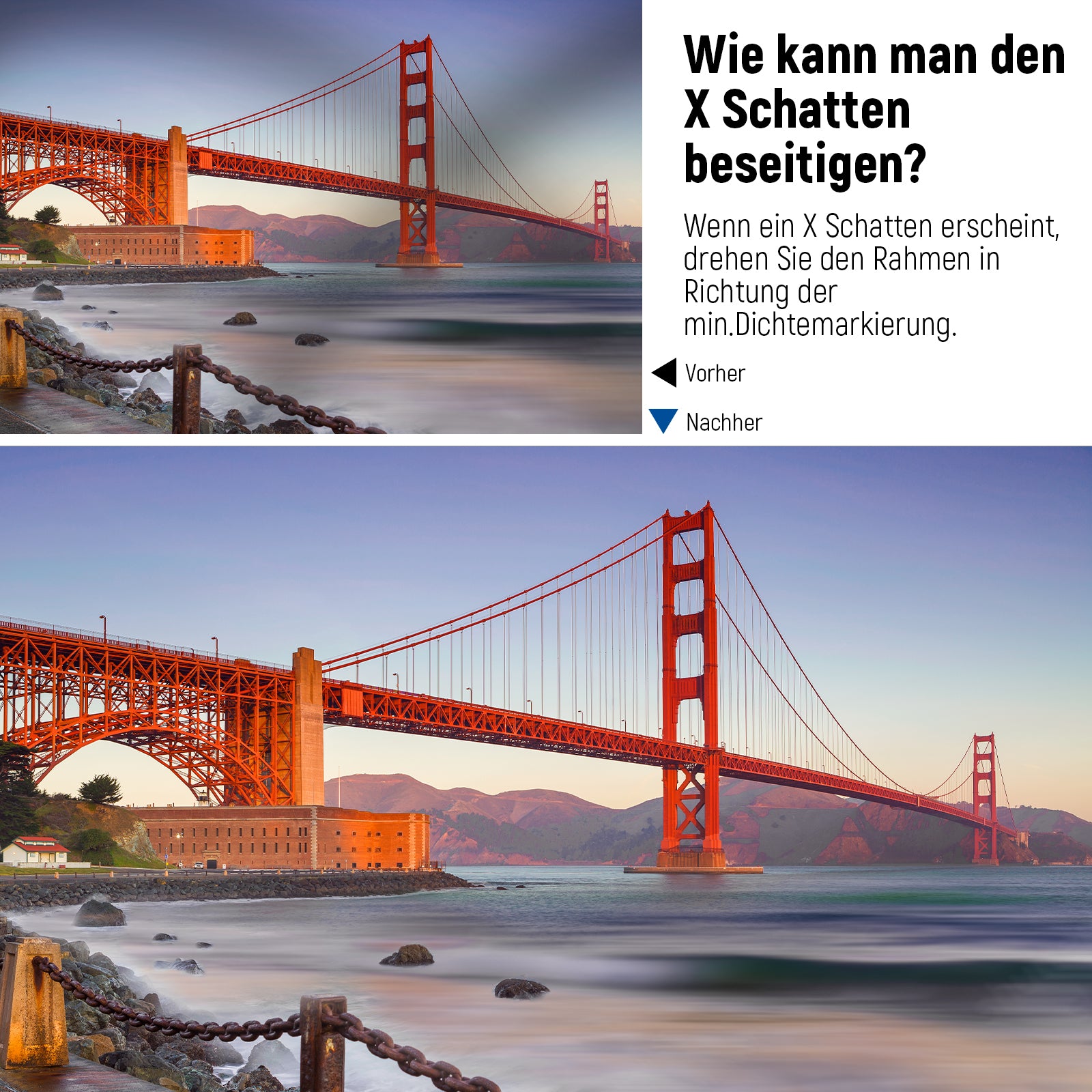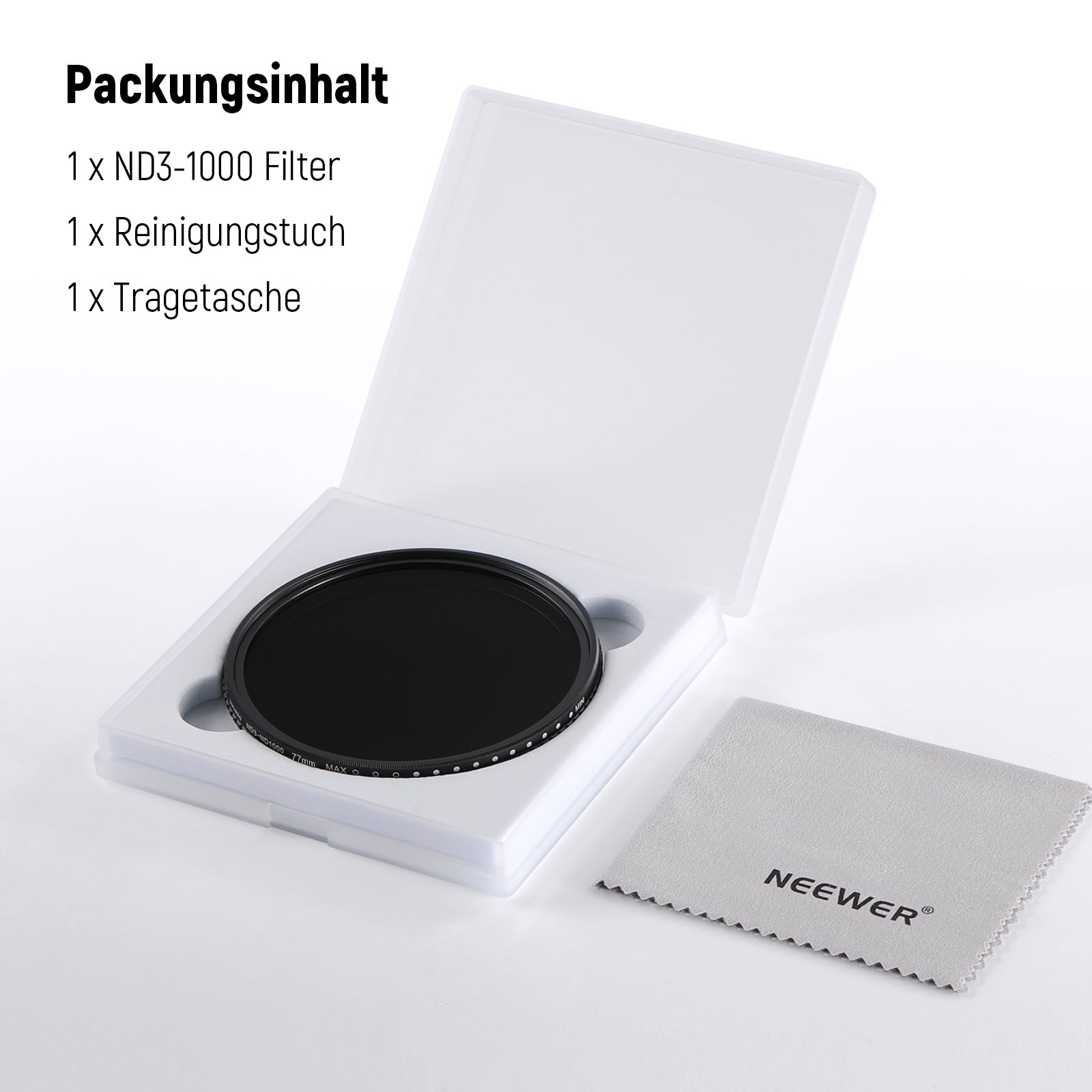 - 【Hinweis zur Verwendung】 (1) Obwohl der Filter mit einem superschlanken Rahmen aus Aluminiumlegierung versiegelt ist, kann es zu X Kreuz oder Vignettierungsproblemen kommen, wenn der Filter auf ND256 gedreht wird. (2) Der tatsächliche Neutraldichtegrad kann von den Markierungen auf dem Filterring abweichen. (3) Bitte besorgen Sie sich einen ND1000 oder ND2000 Filter für Langzeitbelichtungen. (4) Für den 77mm ND Filter ist ein 82mm Objektivdeckel oder eine Blende erforderlich