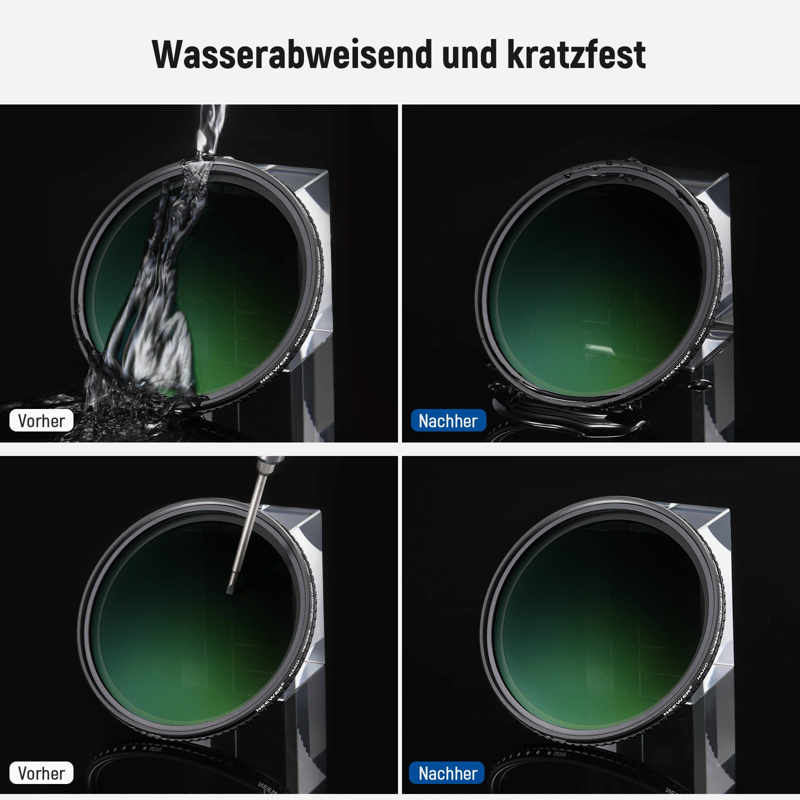 - 【Mehrfach beschichtete optische HD Glaskonstruktion】 Der ND Filter verfügt über doppelseitige Beschichtungen, um Blendung und Reflexion zu reduzieren und gleichzeitig das Glas effektiv vor Wasser, Staub, Öl, Schmutz und Kratzern zu schützen. Das optische HD Glasmaterial hilft, starkes Licht zu blockieren, ohne die Bildschärfe zu verlieren. Der Rändelring bietet festen Halt für eine einfache Montage und Demontage des Filters