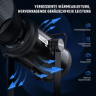 - 12 Szeneneffekte/Stumm/Booster Modus- 12 voreingestellte Lichtszeneneffekte um Ihrer Videokreation auffällige Elemente hinzuzufügen. Unterstützt den Booster Modus mit einer Taste der etwa 210W Leistung und 90000 Lux/1m liefern kann während der Lüfter automatisch eingeschaltet wird, um die Wärmeableitung zu verbessern. Der Lautlosmodus liefert etwa 60W Leistung und 30000 Lux/1m, wobei der Lüfter ausgeschaltet bleibt, geeignetes Filmlicht für Fotoshootings und Filmaufnahmen von Kindern/Haustieren