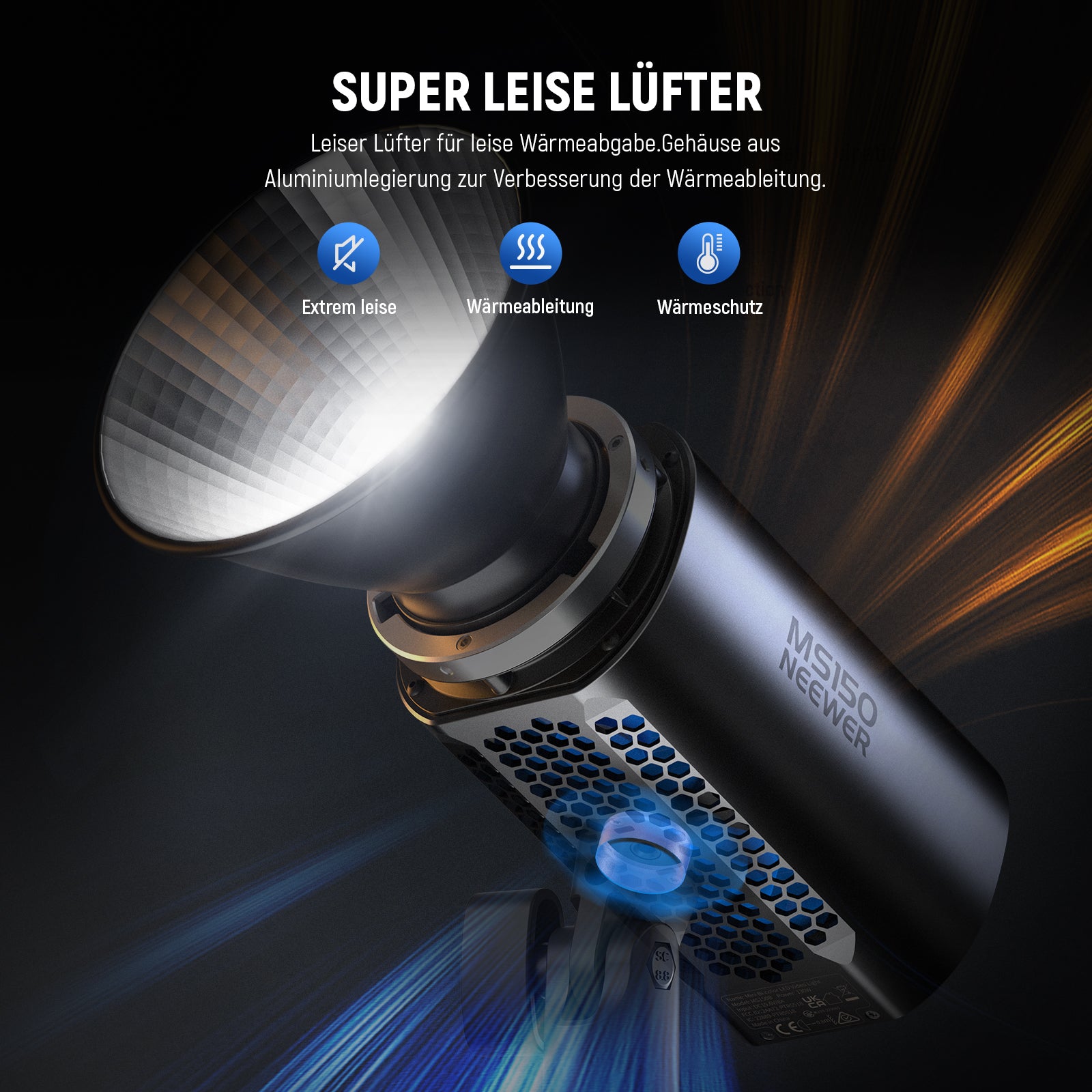 - Kontinuierliches COB LED Studioleuchte-MS150 Studio Licht verfügt über eine Leistung von 130W, eine maximale Beleuchtungsstärke von 66800Lux/1m, 5600K Tageslicht, 9 Szeneneffekte für Videoaufnahmen und einen CRI 97+/TLCI 98+ für eine genaue Farbwiedergabe. Das Studiolicht ist bei einer Verschlusszeit von 1/2000s flimmerfrei. Mit der erweiterten PWM Dimmung können Sie die Helligkeit in 1% Schritten präzise von 0 bis 100% anpassen
