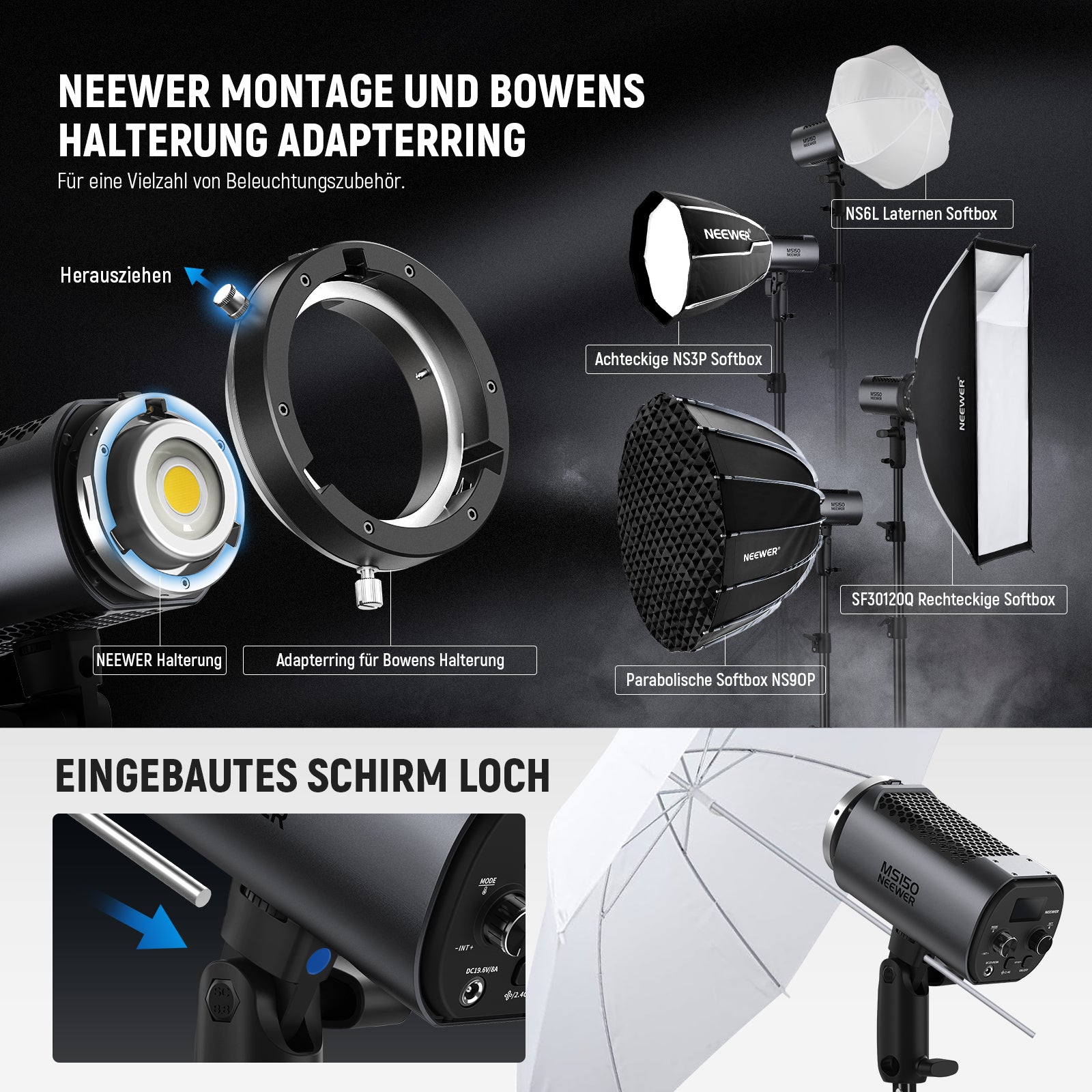 - Bowens Montageadapter im Lieferumfang enthalten- Mit der NEEWER Halterung, dem Bowens Montageadapter und der Schirmfassung können Softboxen, Fotoschirme, Beauty Dishes und andere Lichtmodifikatoren für Porträtfotografie, Interviews, YouTube/TikTok Videos, Filmen und Live Streaming angeschlossen werden