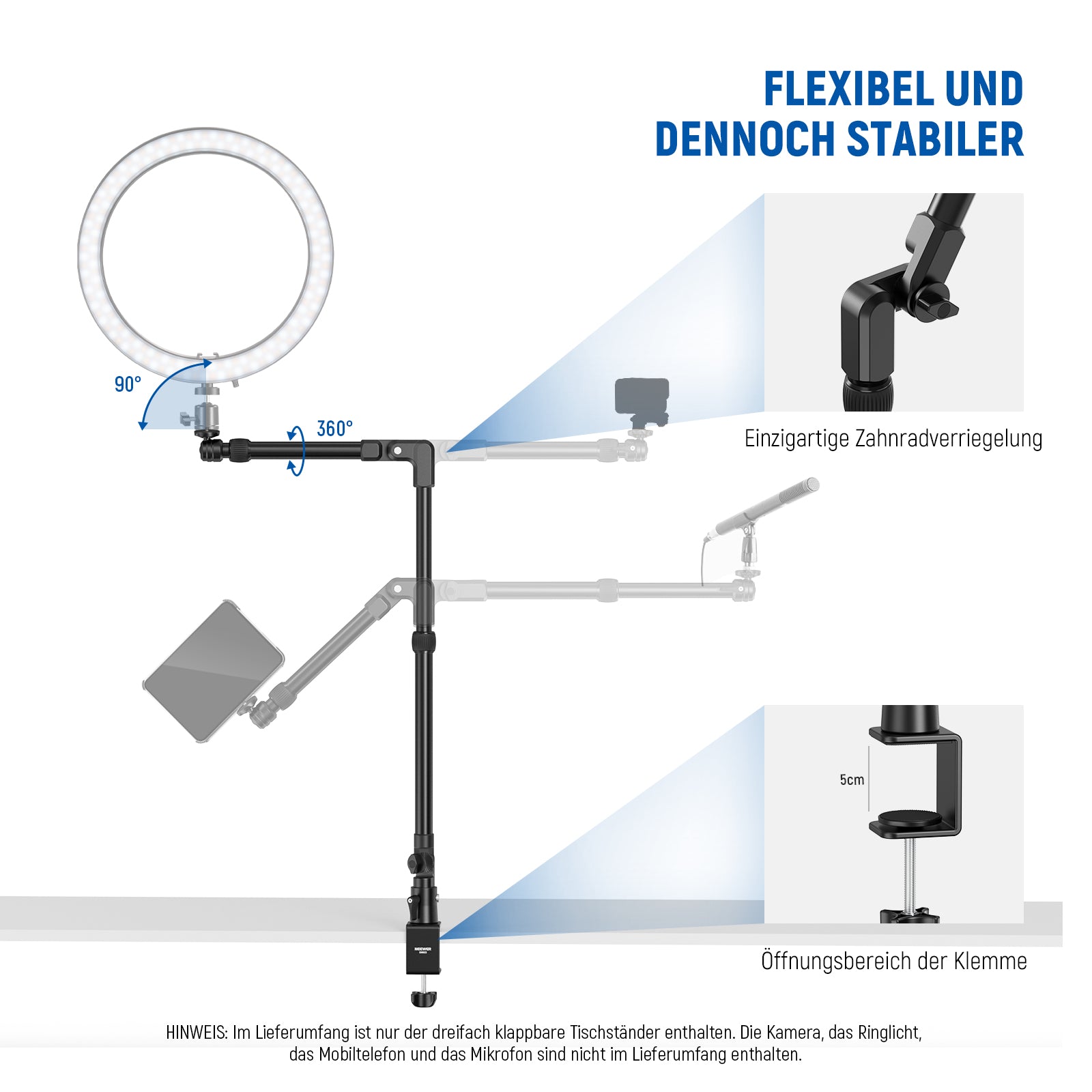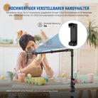 Ideal für Handy-Fotografie- Der Schreibtisch-Kamera-Ständer enthält eine Handyhalterung für Handys, um die meisten Smartphones auf dem Markt zu befestigen, kompatibel mit iPhone 16, 15 Pro Max, 15 Plus, 14, 13, 12 Pro Max, 13, 12 Mini, Samsung Galaxy S23, S22, S21 Ultra, Huawei P60, Mate60, Google Pixel 7 Pro Oppo, und Mehr Ideale Fotoausrüstung als Zubehör und Ausrüstung für Overhead-Live-Streaming, Filmen von Inhalten, Selfies und mehr