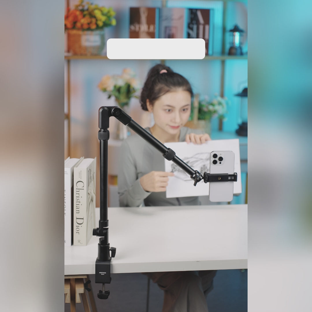 - Schnelle Einrichtung- Der Gelenkarm wird montiert und sofort einsatzbereit geliefert. Montieren Sie die C-Klemme einfach auf einem Schreibtisch mit einer Dicke von bis zu 5 cm, verbinden Sie sie mit dem Auslegerarm und verriegeln Sie sie sicher. Befestigen Sie dann Ihre Kamera oder Action-Kameras (kompatibel mit DJI Osmo Pocket 3 2 Creator Combo Insta360 X5 X4 X3 Insta 360 Ace Pro Go 3S) über die 1/4-Zoll-Schraube oder sichern Sie Ihr Smartphone in der Handyhalterung