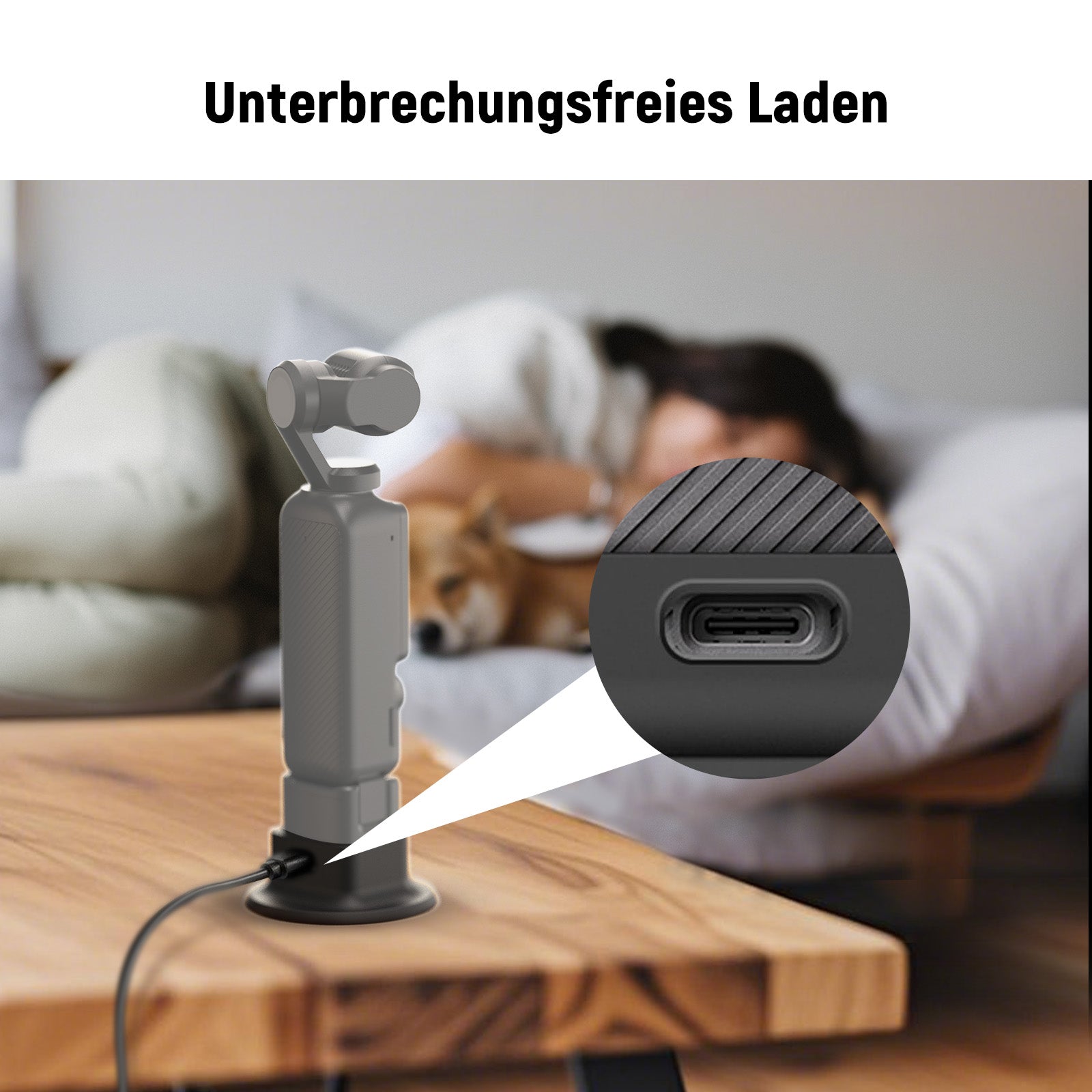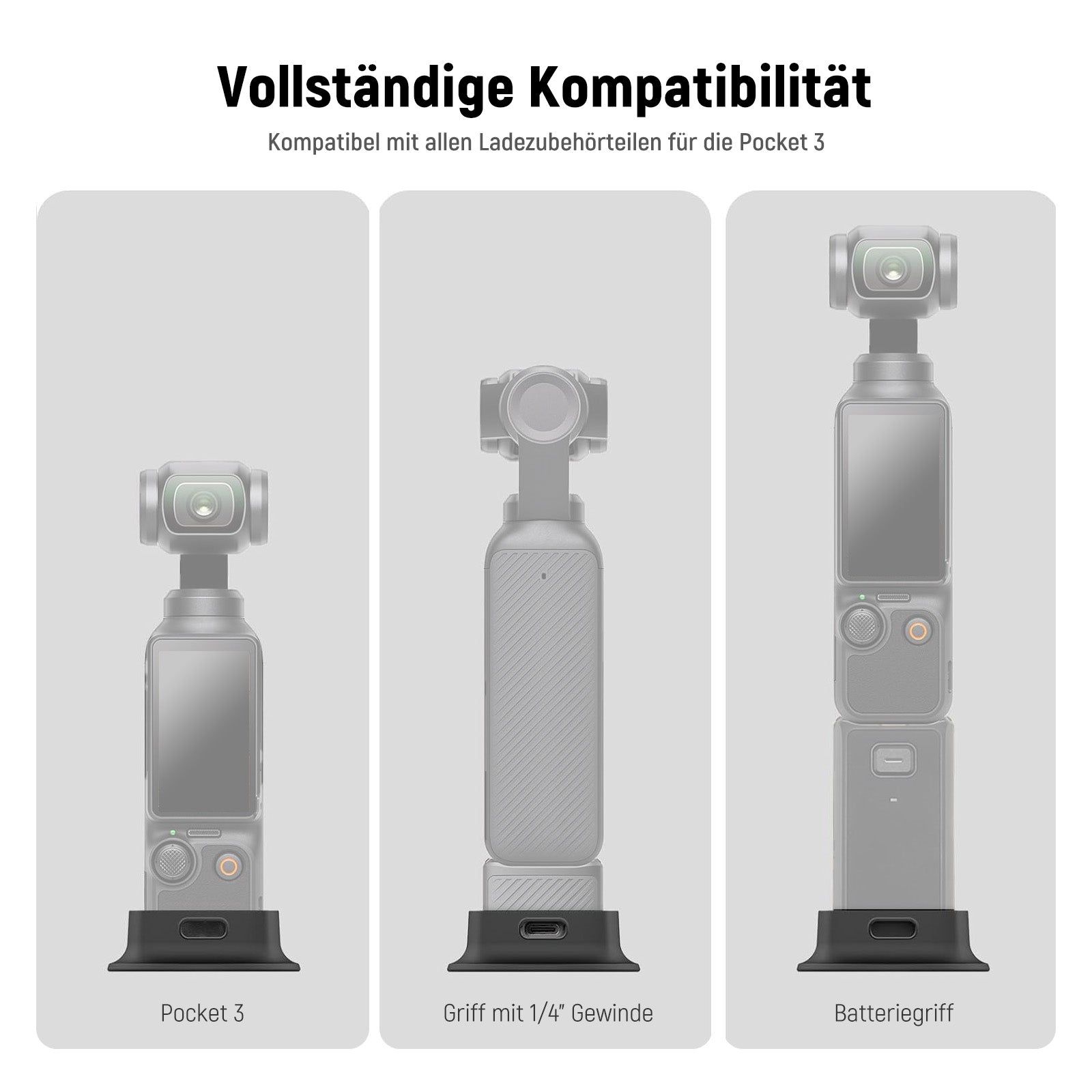 - Ungehindertes Aufladen- Hält den USB Typ C Ladeanschluss für unterbrochenes Laden vollständig zugänglich. Hinweis: Die Verwendung der Basis kann die Kompatibilität mit bestimmten Zubehörteilen des Pocket 3 Creator Combo beeinträchtigen