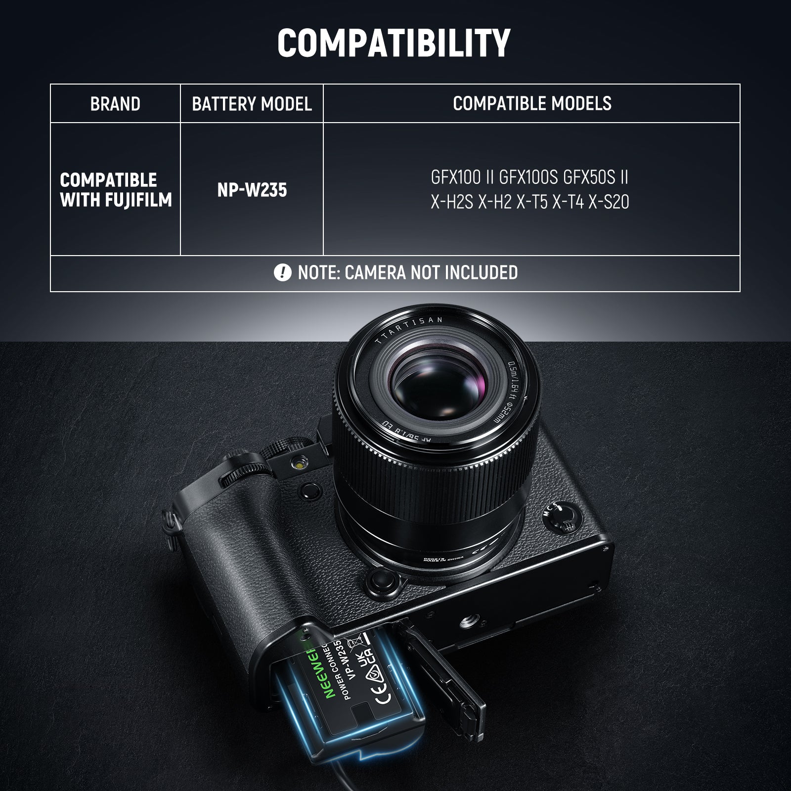 - Kompatible Gerätemodelle- Diese Ersatzbatterie ist eine Ersatzbatterie für Fujifilm NP-W235 und ist voll kompatibel mit Fujifilm GFX100 II GFX100S GFX50S II X-H2S X-H2 X-T5 X-T4 X-S20 Kameras