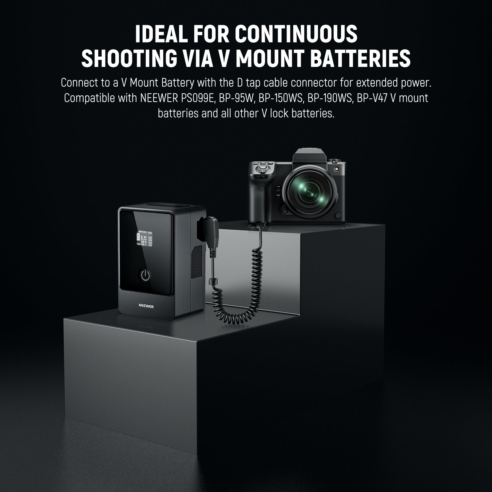 - Ideal für kontinuierliche Aufnahmen über V-Mount-Batterien-. Mit einem D Tap Kabelanschluss, kann es mit NEEWER PS099E, BP-95W, BP-150WS, BP-190WS, BP-V47 V-Mount Batterien und allen anderen V Lock Batterien funktionieren. Kompatibel mit SmallRig V Mount Akku Serie, kompatibel mit Sony BP-U65 BP-U68 BP-U100 BP-U90 V Mount Akkus