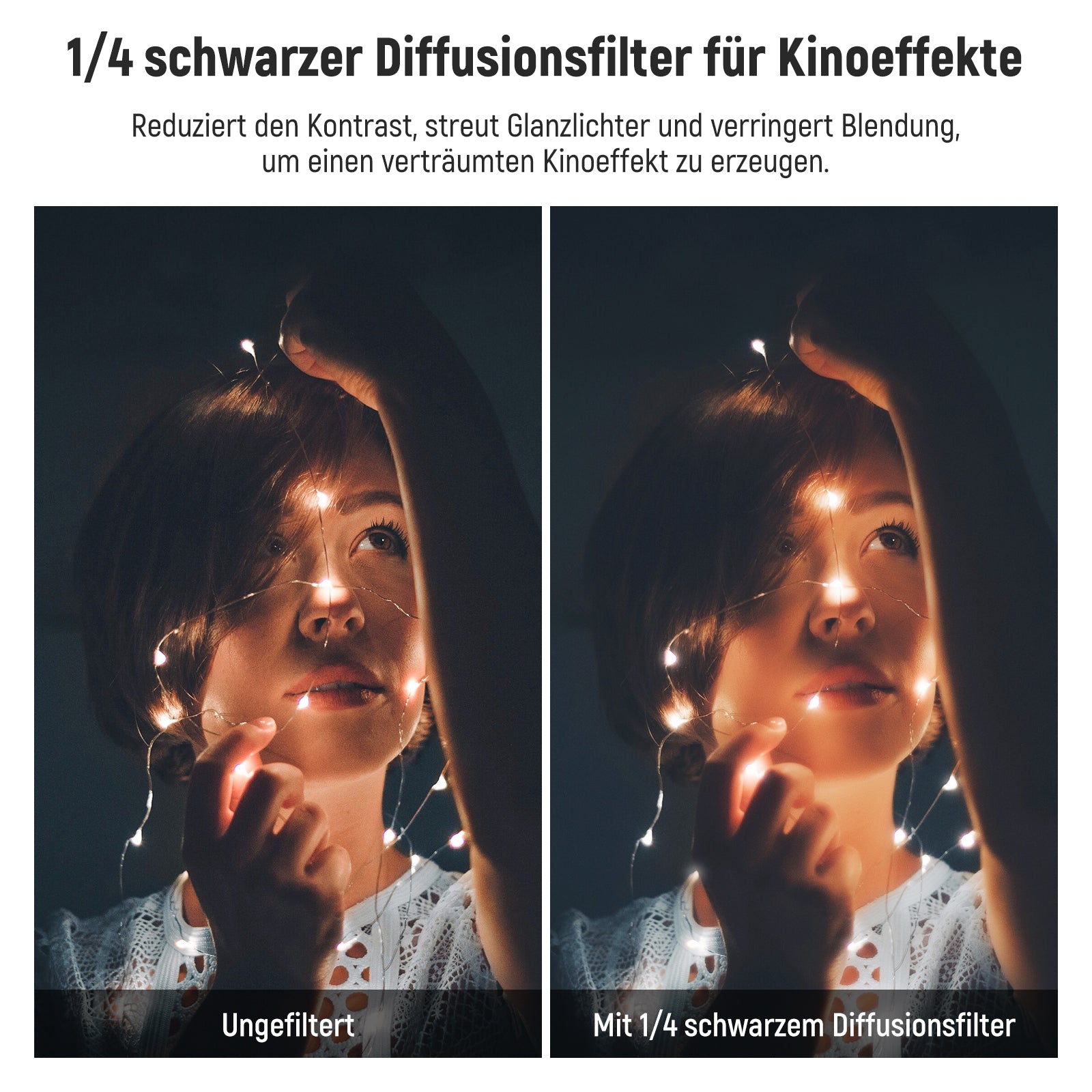 - 【1/4 Schwarzdiffusionsfilter für Kinoeffekte】Der 1/4 Stop Schwarzdiffusionsfilter reduziert effektiv Glanzlichter und verringert Blendung, um einen glatteren und weicheren Hautton für einen verträumten Kinoeffekt auf Video und Fotobildern zu erzielen. Ideal für Porträtfotografie, Videoaufnahmen und Vlogging
