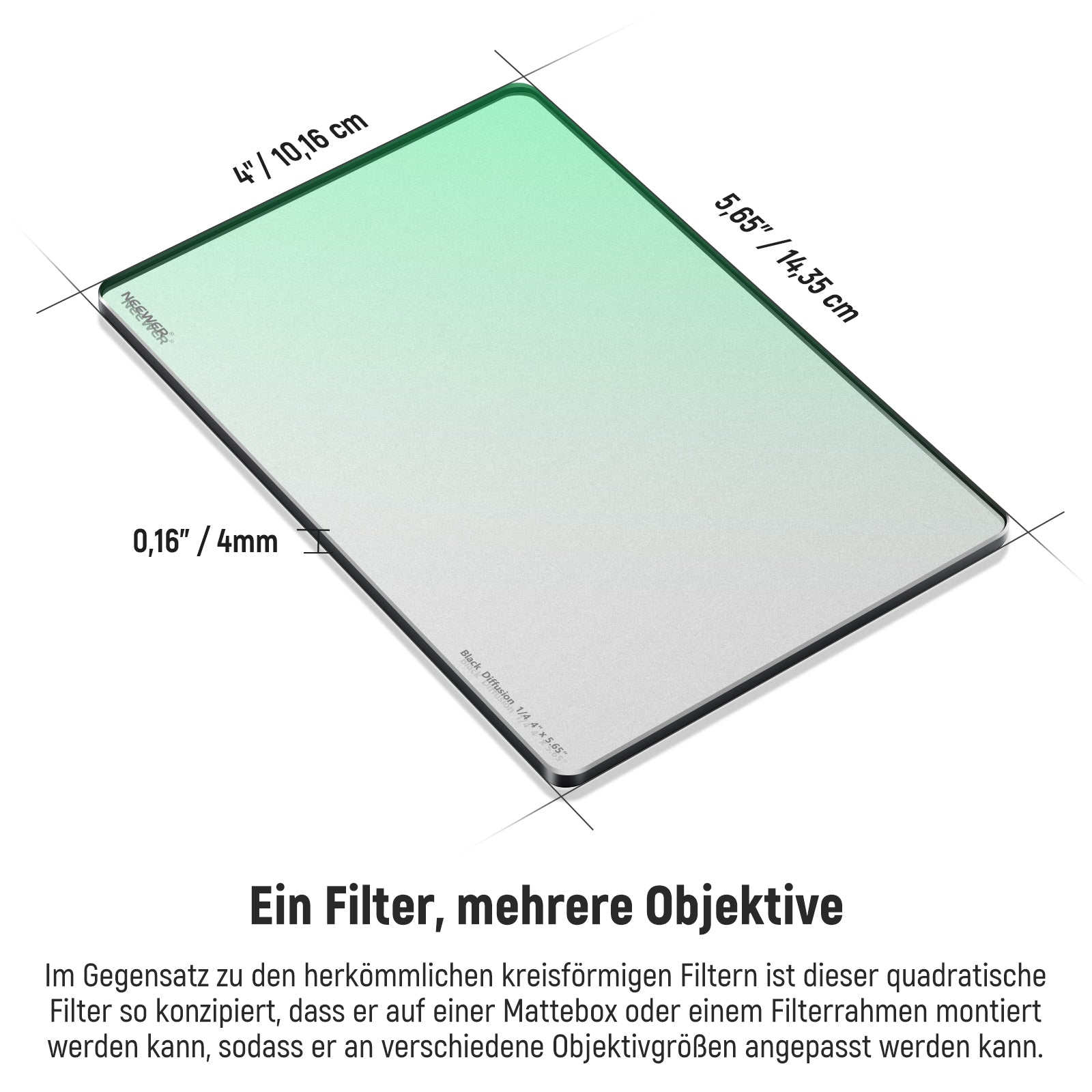 - 【Super dünn und leicht】 0,16"/4mm dick und wiegt nur 5,12Unzen/147g. Dieser ultraflache und leichte Filter verleiht Ihrem Filmseinrichtung kaum merkliches Gewicht, wenn er montiert ist. Bewahren Sie ihn in der Tragetasche auf, um ihn sicher aufzubewahren und einfach zu transportieren Hinweis: Der NEEWER schwarze quadratische Diffusionsfilter kann nicht direkt auf Ihr Kameraobjektiv geschraubt werden.