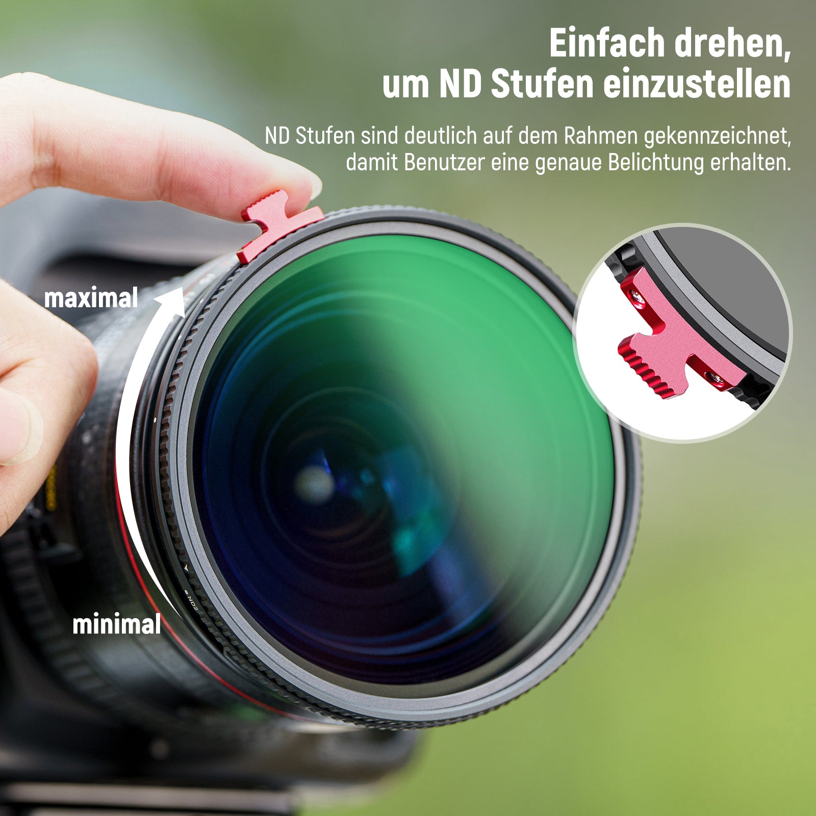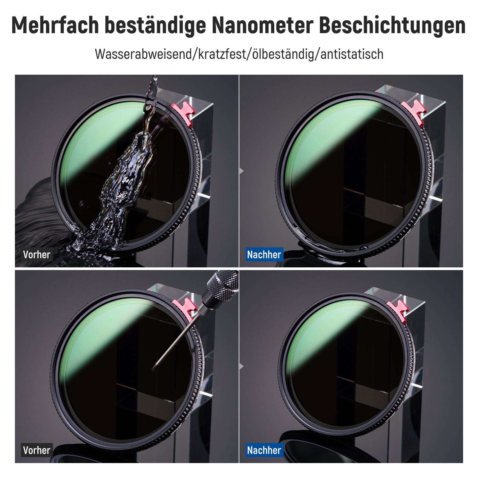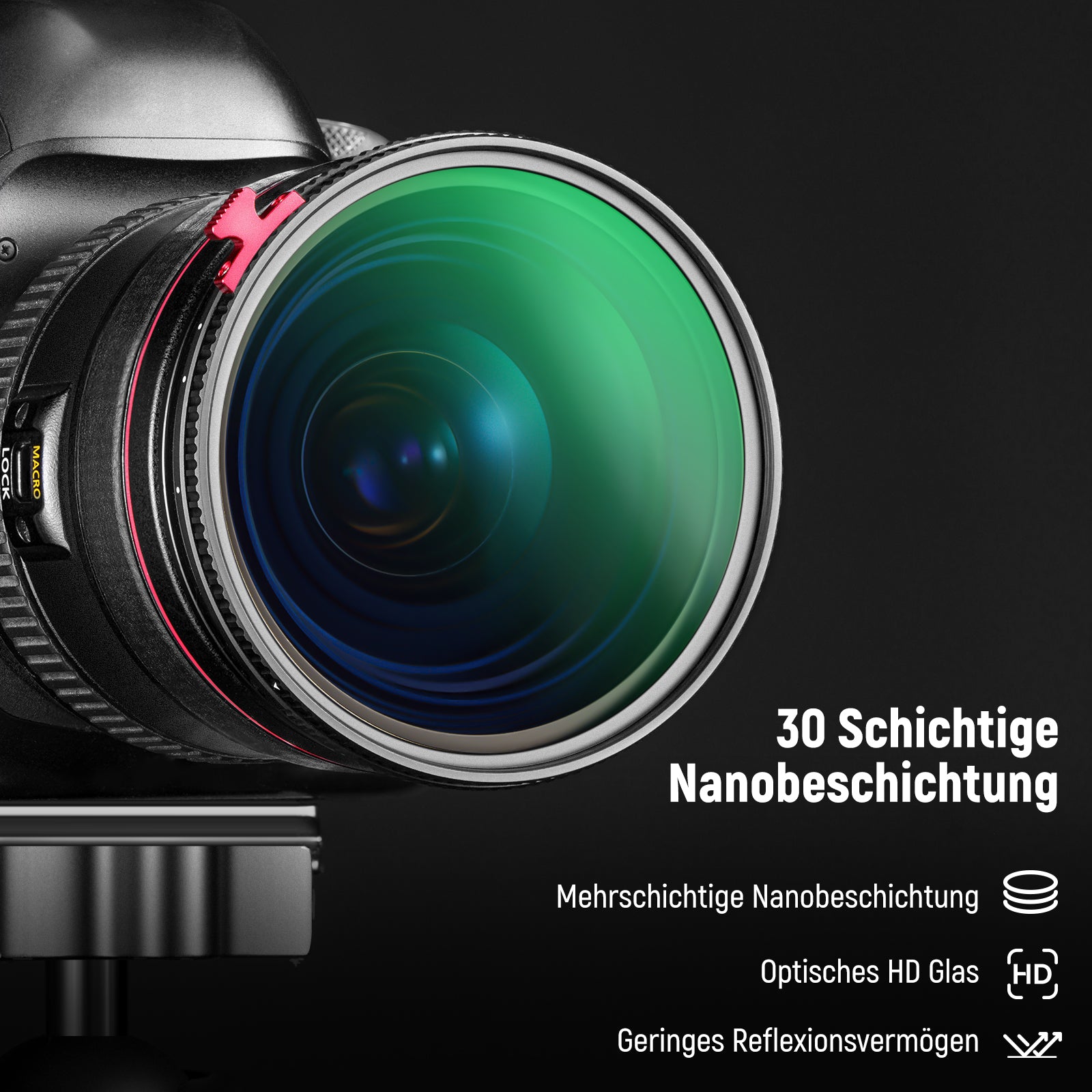 - 【Mehrfache NANO Beschichtung ohne Farbverschiebung】 Der 2 in 1 variable Diffusionsfilter ND2-ND32 und 1/4 Diffusionsfilter ist schlank und leicht und liefert scharfe Bilder, ohne X Kreuzschatten zu werfen. Die 30 Schichtige Nanobeschichtung auf beiden Seiten des Filters machen ihn wasserabweisend, kratzfest, ölfest und beständig gegen Fingerabdrücke. Keine Farbverschiebung