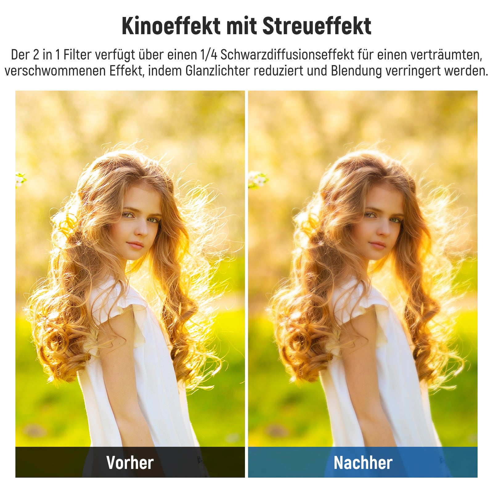 - 【Kinoeffekt mit 1/4 Schwarz Diffusionseffekt】 Der Filter verfügt auch über einen 1/4 Schwarz Diffusionseffekt für einen verträumten, verschwommenen Effekt, indem Glanzlichter reduziert und Blendung verringert werden. Es hilft, die Haut in der Porträtfotografie glatter aussehen zu lassen