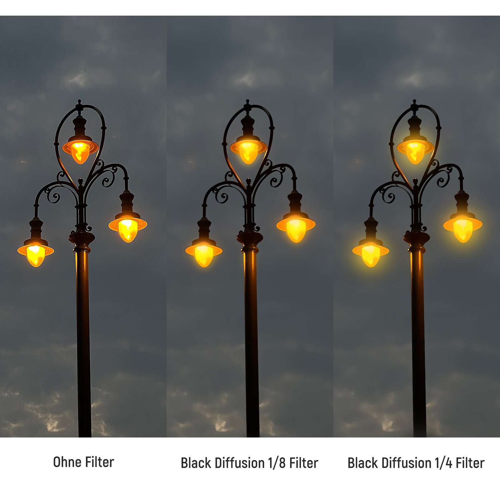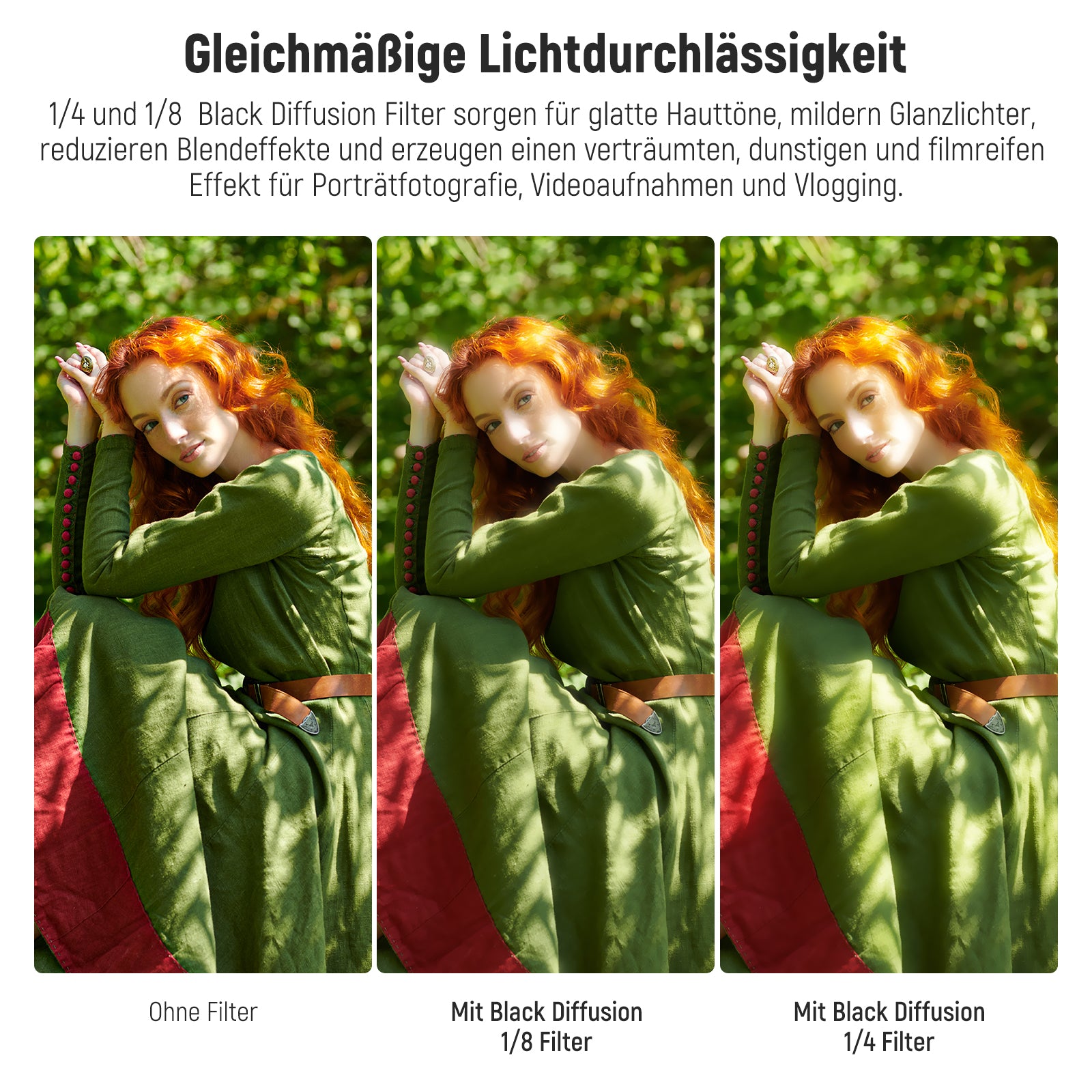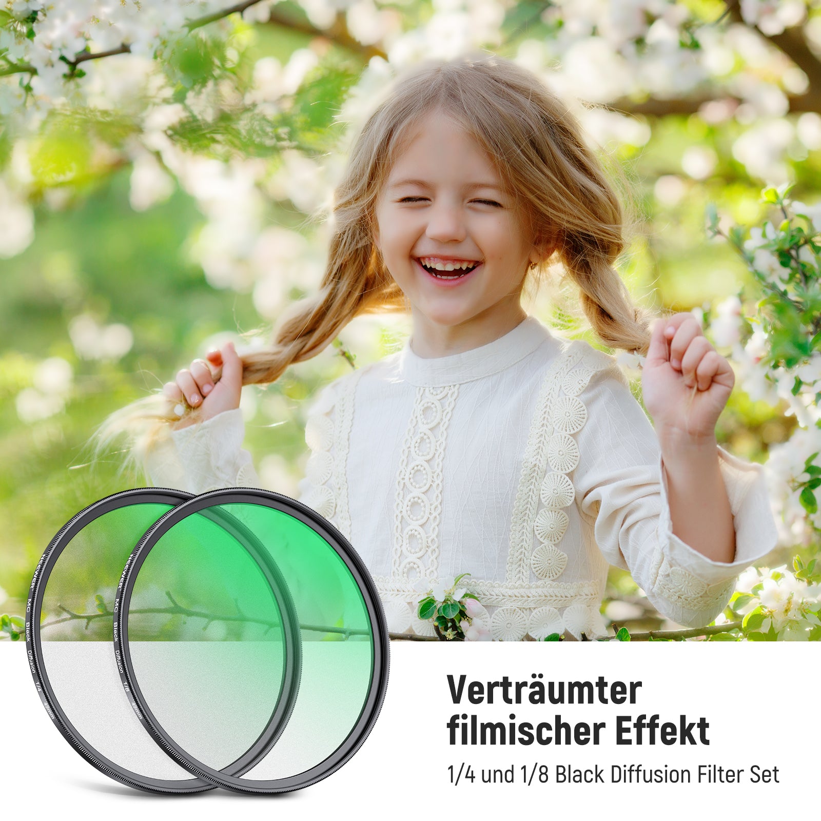 - 1/4 & 1/8 Black Diffusion Filter Set- 1/4 und 1/8 Black Diffusion Filter sorgen für glatte Hauttöne, mildern Lichter, reduzieren Blendeffekte und erzeugen einen verträumten, verschwommenen und filmischen Effekt für Porträtfotografie, Videoaufnahmen und Vlogging
