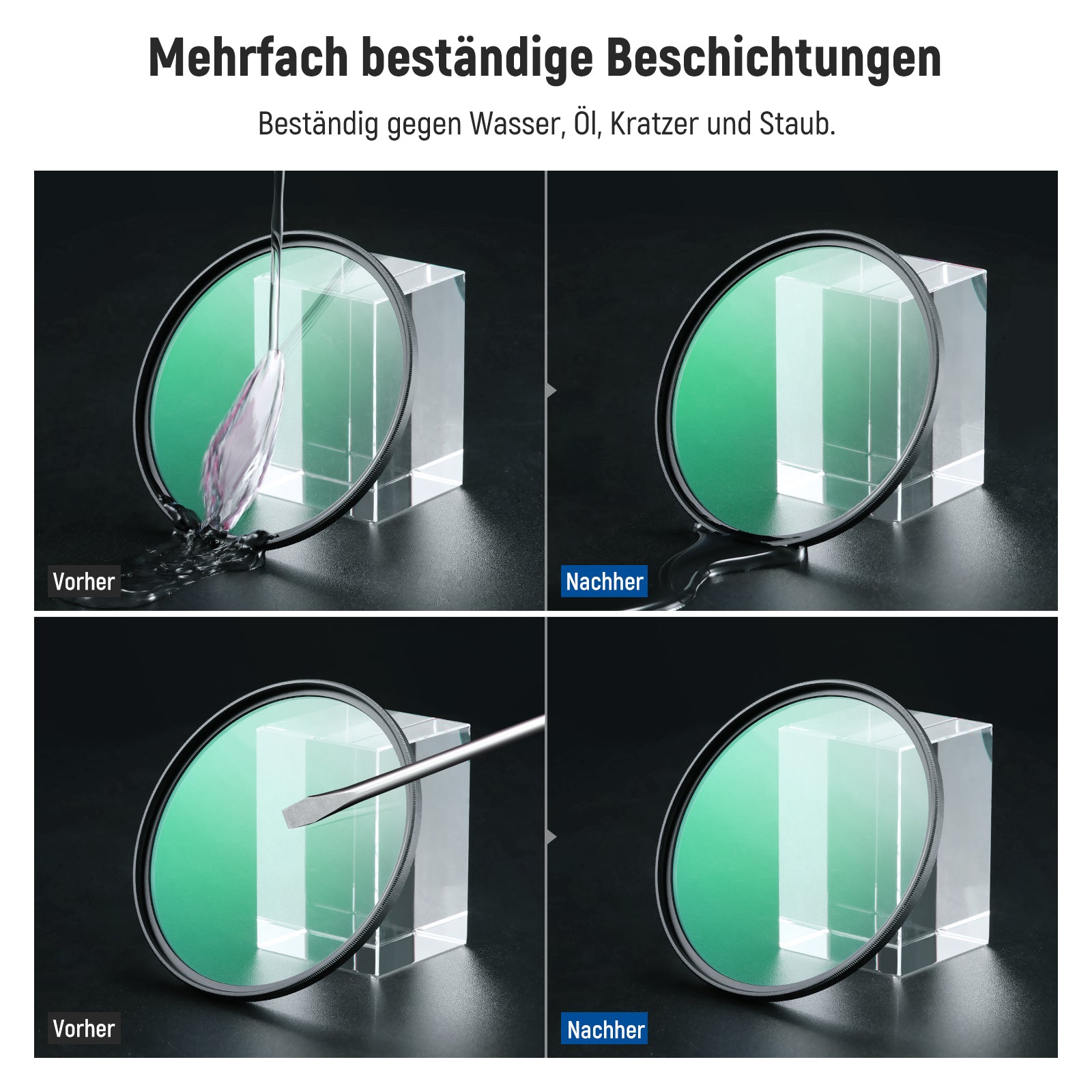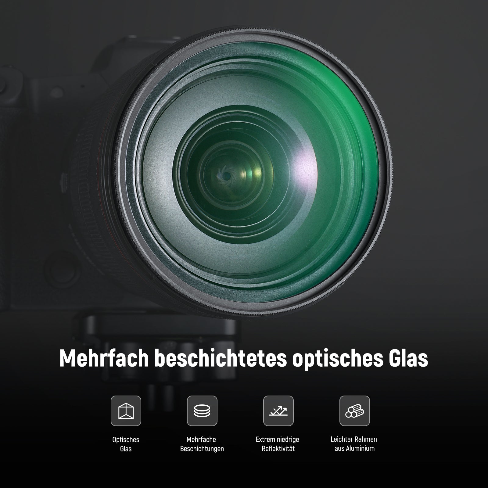 - 30 Schichten von Nanometer Beschichtungen- 30 Schichten Nanometerbeschichtung auf beiden Seiten der Filter reduzieren die Reflexion aus allen Richtungen und den Filter selbst und sind resistent gegen Wasser, Öl, Kratzer und Fingerabdrücke