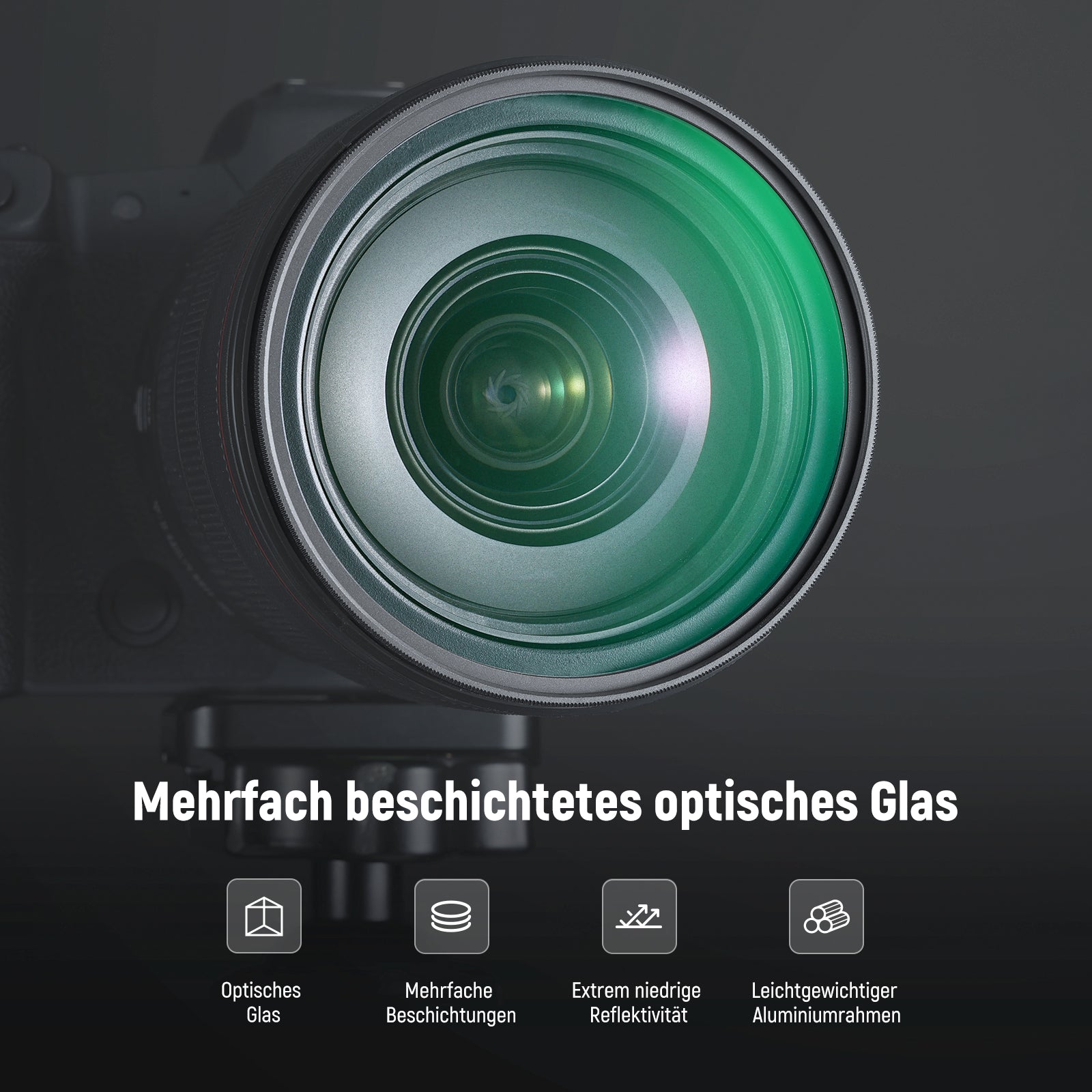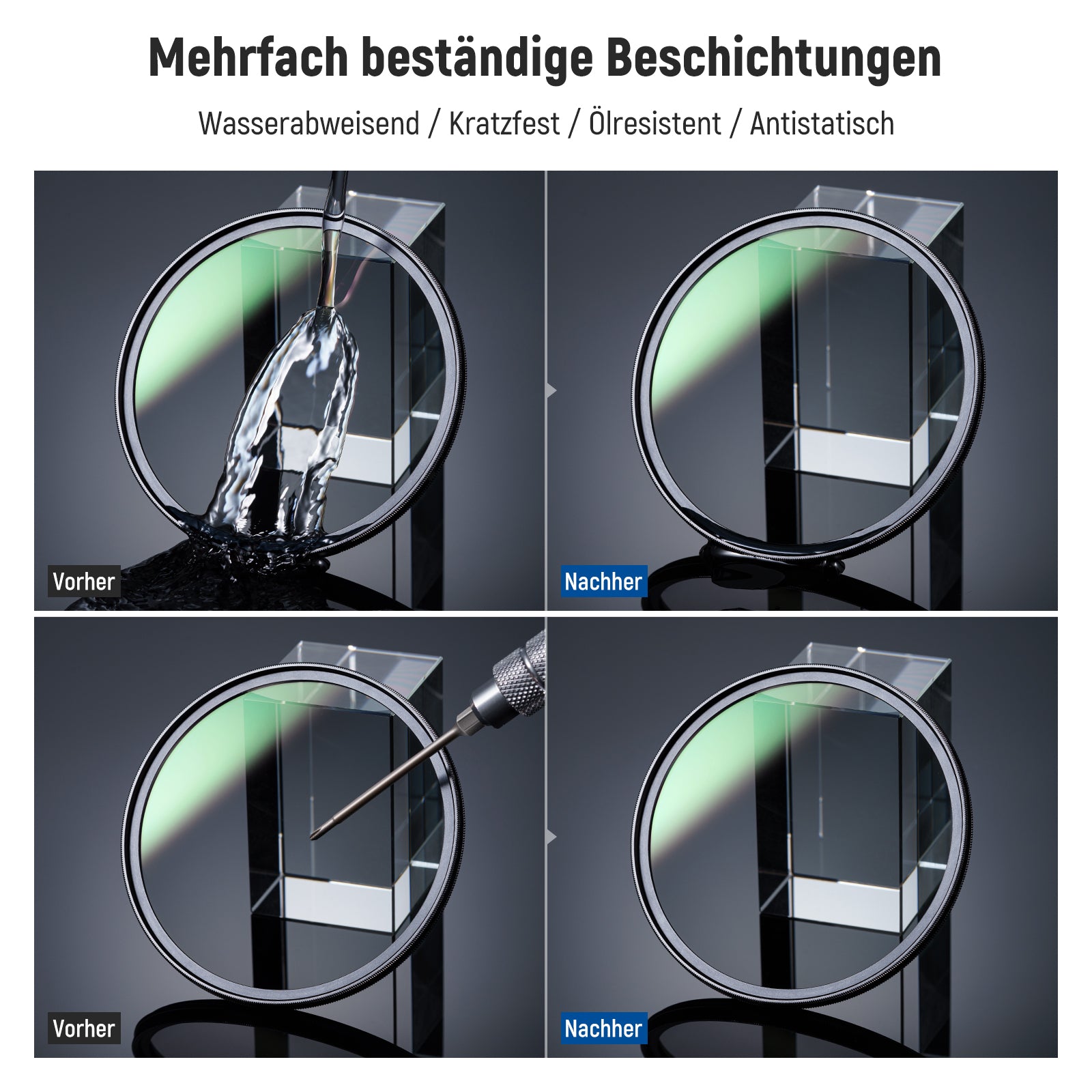 - Mehrere Schutzbeschichtungen- Mehrschichtige Schutzbeschichtungen auf beiden Seiten des optischen Glases schützen den Filter vor Wasser, Öl, Staub und Kratzern. Reinigungstücher für die tägliche Wartung sind im Lieferumfang enthalten. Perfekt für Content Creators und Influencer, unverzichtbare Fotoausrüstung und Digitalkamera Zubehör