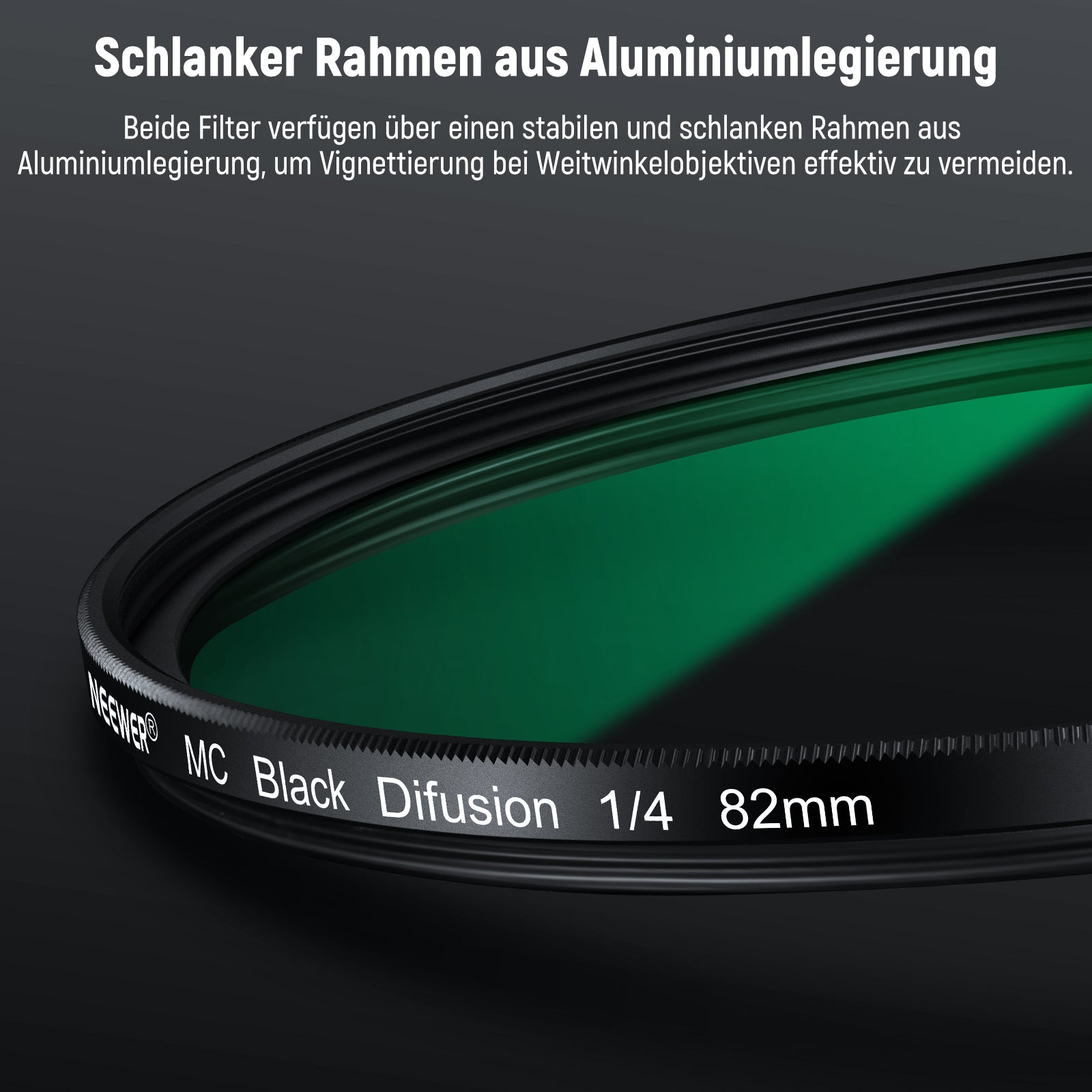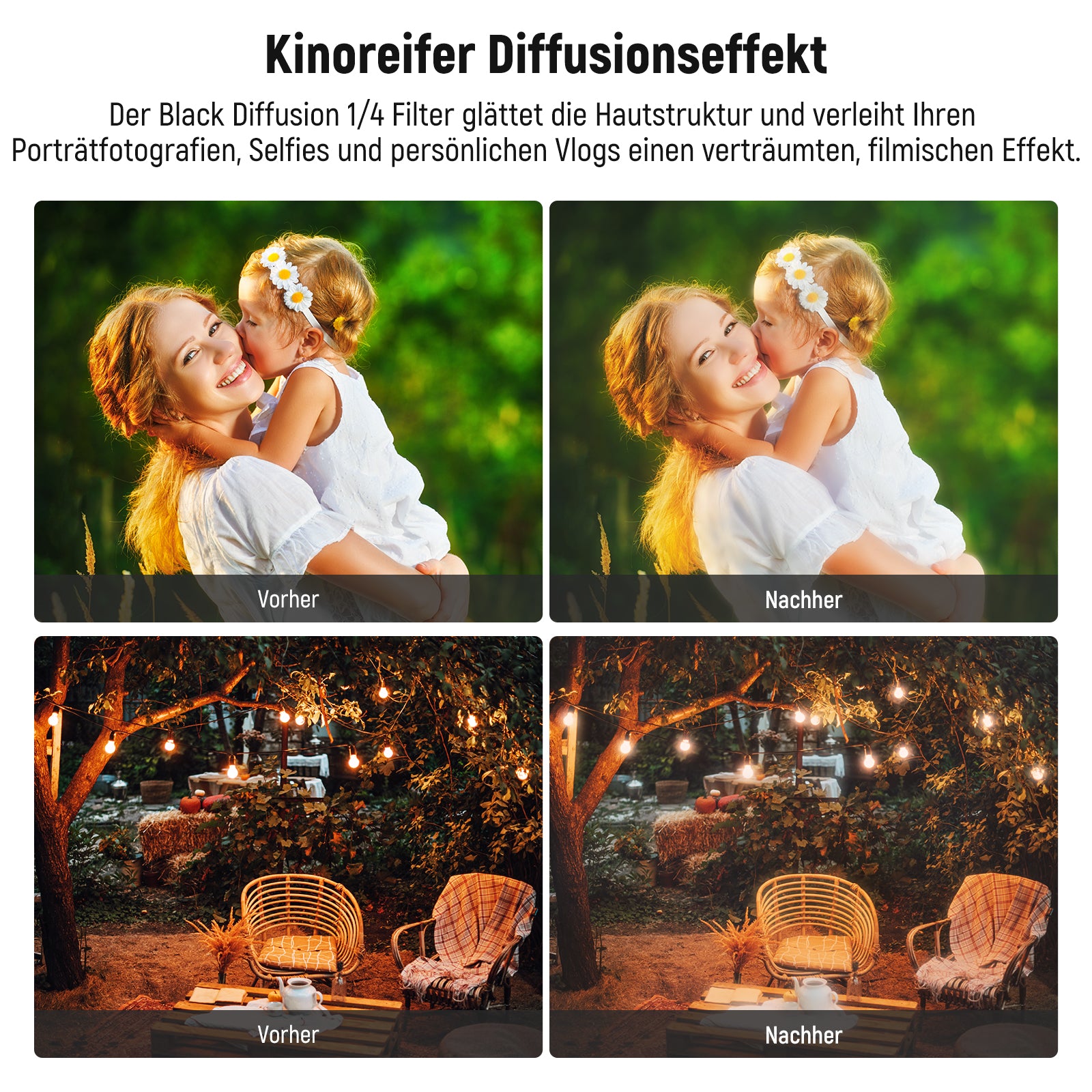 - Filmischer Diffusor Effekt- Der Black Diffusion 1/4 Filter glättet die Hautstruktur und verleiht Ihren Porträtfotografien, Selfies und persönlichen Vlogs einen verträumten, filmischen Effekt