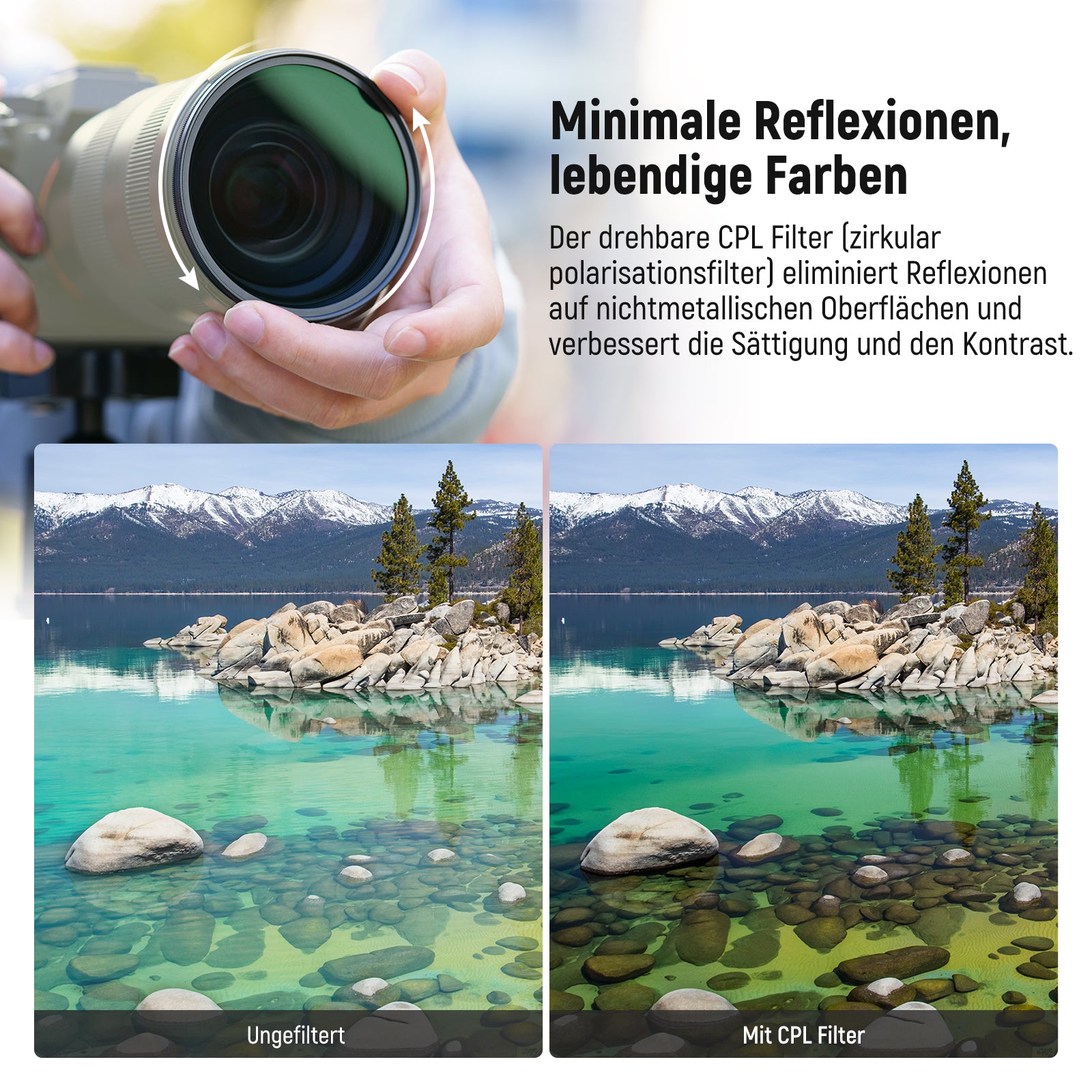 - Minimierte Reflexionen, lebendige Farben- Der CPL Filter (Zirkular Polarisationsfilter) eliminiert Reflexionen und Blendungen von Glas, Wasser und anderen nichtmetallischen Oberflächen und verbessert gleichzeitig die Sättigung und den Kontrast