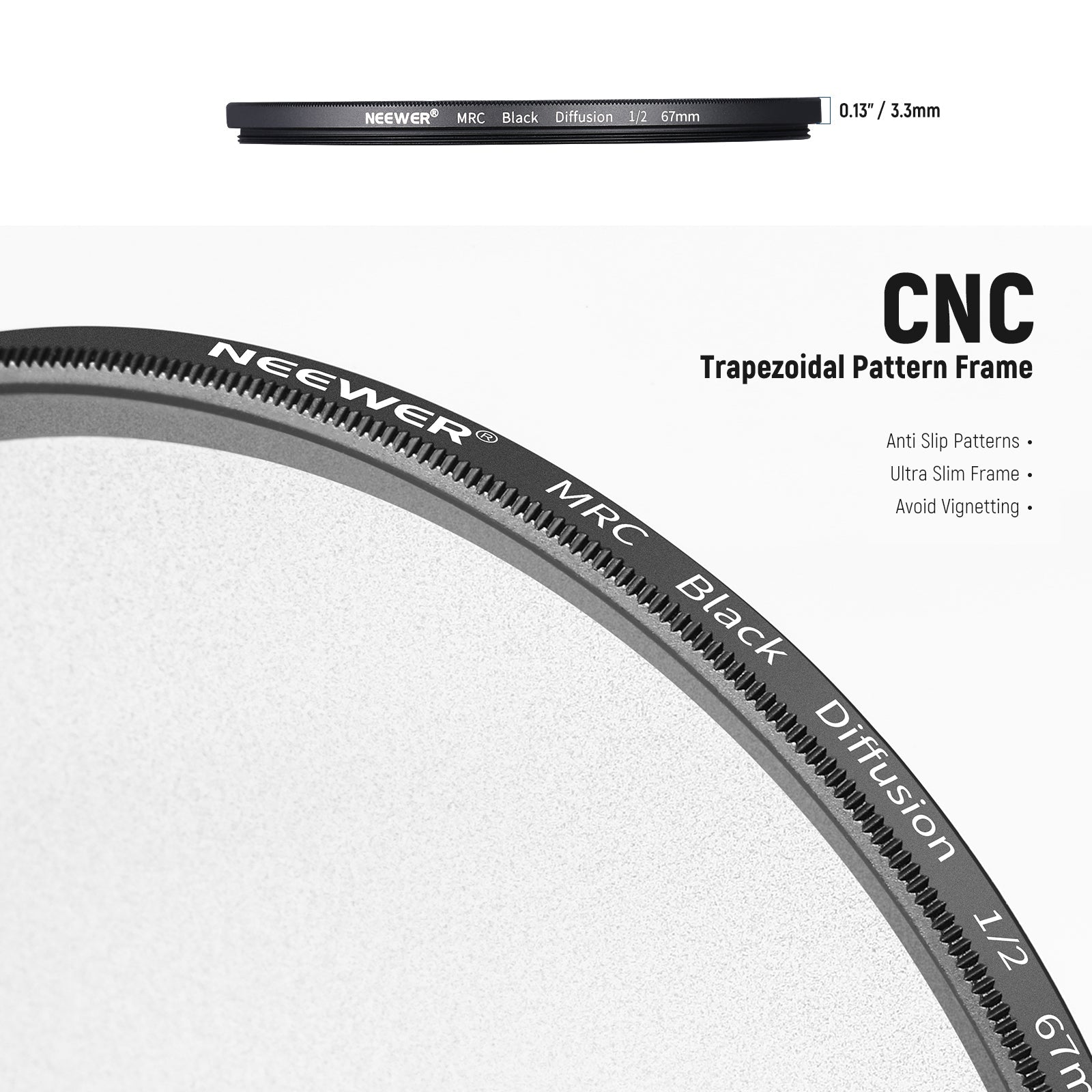 - 【CNC rutschfester & ultraflacher Rahmen】Dieser ultraflache Rahmen mit schwarzem Diffusionsfilter 1/2 und CNC Trapezmuster weist nur 0,13 Zoll/3,3mm auf und vermeidet Vignettierung und dunkle Ecken bei Weitwinkel und Teleobjektiven; Der rutschfeste CNC Designrahmen ist einfach zu installieren und zu entfernen.