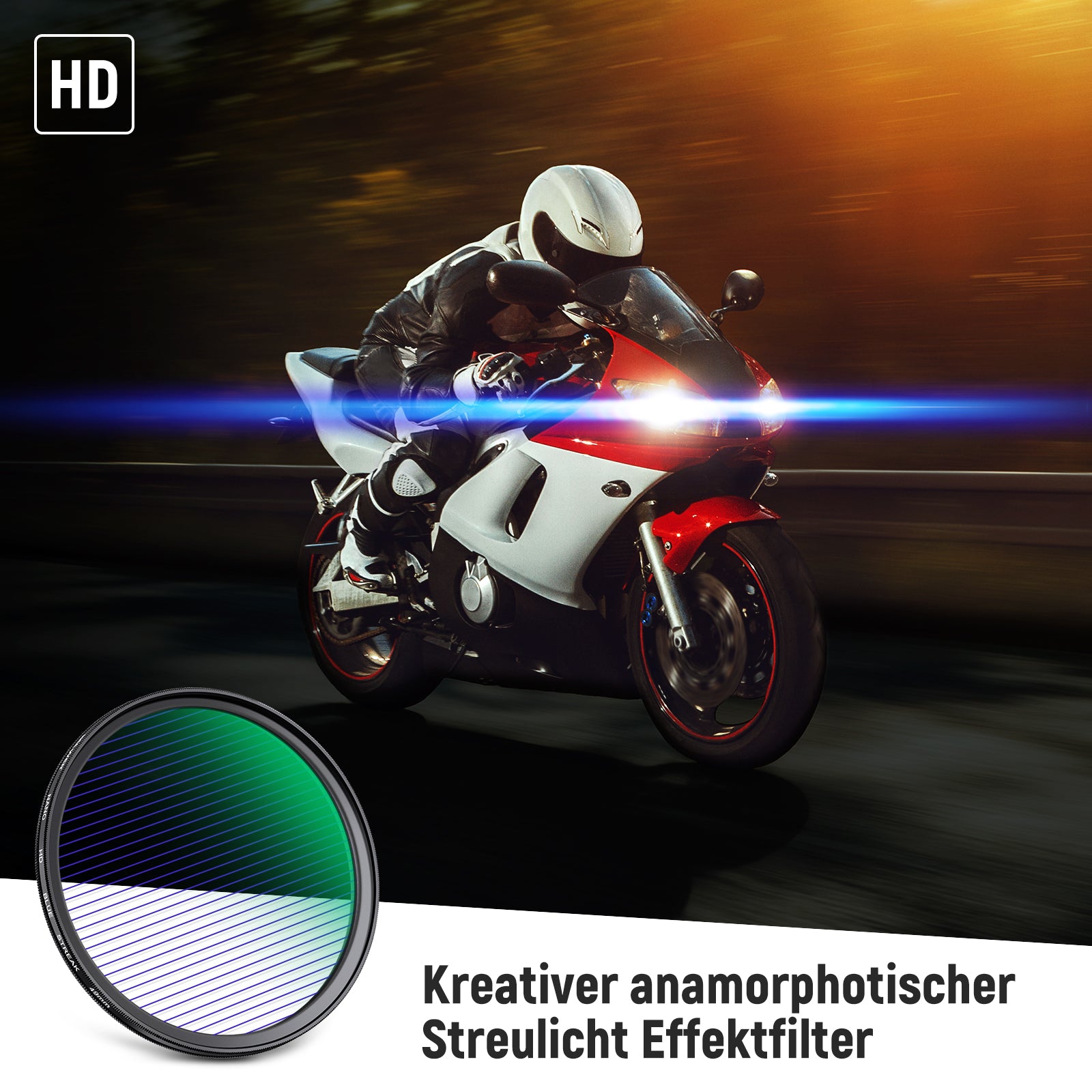- 【Werden Sie jederzeit und überall kreativ】 Der kompakte Effektfilter wird mit einer Filterbox geliefert, damit Benutzer ihn problemlos in der Tasche oder in einem Rucksack tragen können. Gut geeignet für Werbeaufnahmen für Autos und Fahrzeuge, Landschaftsfotografie, Hochzeitsfotografie für kreative anamorphotische Streulichteffekte