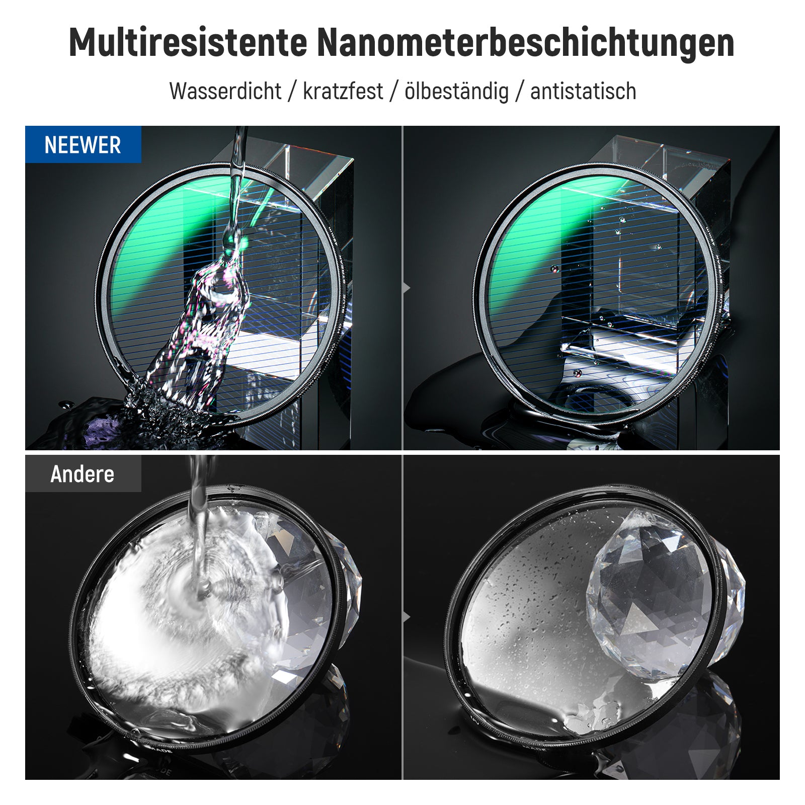 - 【Multiresistent beschichtetes optisches HD-Glas】 Der Filter besteht aus hochwertigem optischem HD-Glas und ist gut poliert, um eine gleichmäßige Lichtdurchlässigkeit zu erzielen und die Bildschärfe zu gewährleisten. Der mehrfach beschichtete Filter verhindert effektiv, dass Ihr Objektiv zerkratzt und die 28 lagige Beschichtung macht den Filter wasserabweisend und ölbeständig